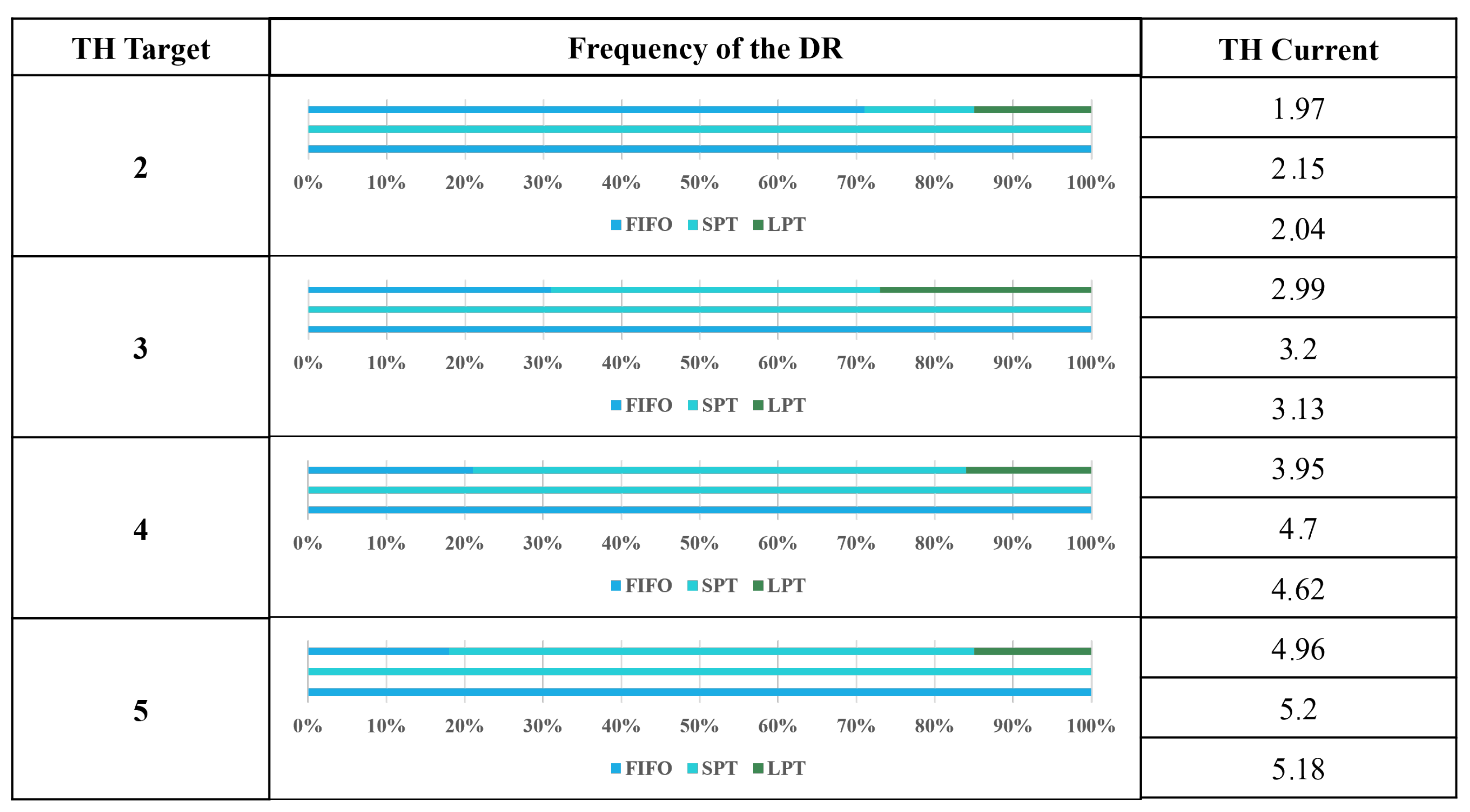 Figure 6 summarises the results: the first column lists the TH target for each scenario; the central panel displays horizontal stacked bars indicating the relative frequency with which each rule (FIFO, SPT, LPT) was selected by the DQN agent; and the right column (“TH current”) reports the mean throughput achieved by the static FIFO, static SPT, and proposed DQN-based policy, averaged over all replications. This structure allows a direct visual comparison between the agent’s adaptive rule-selection behaviour and the performance of fixed-rule benchmarks across different production targets.