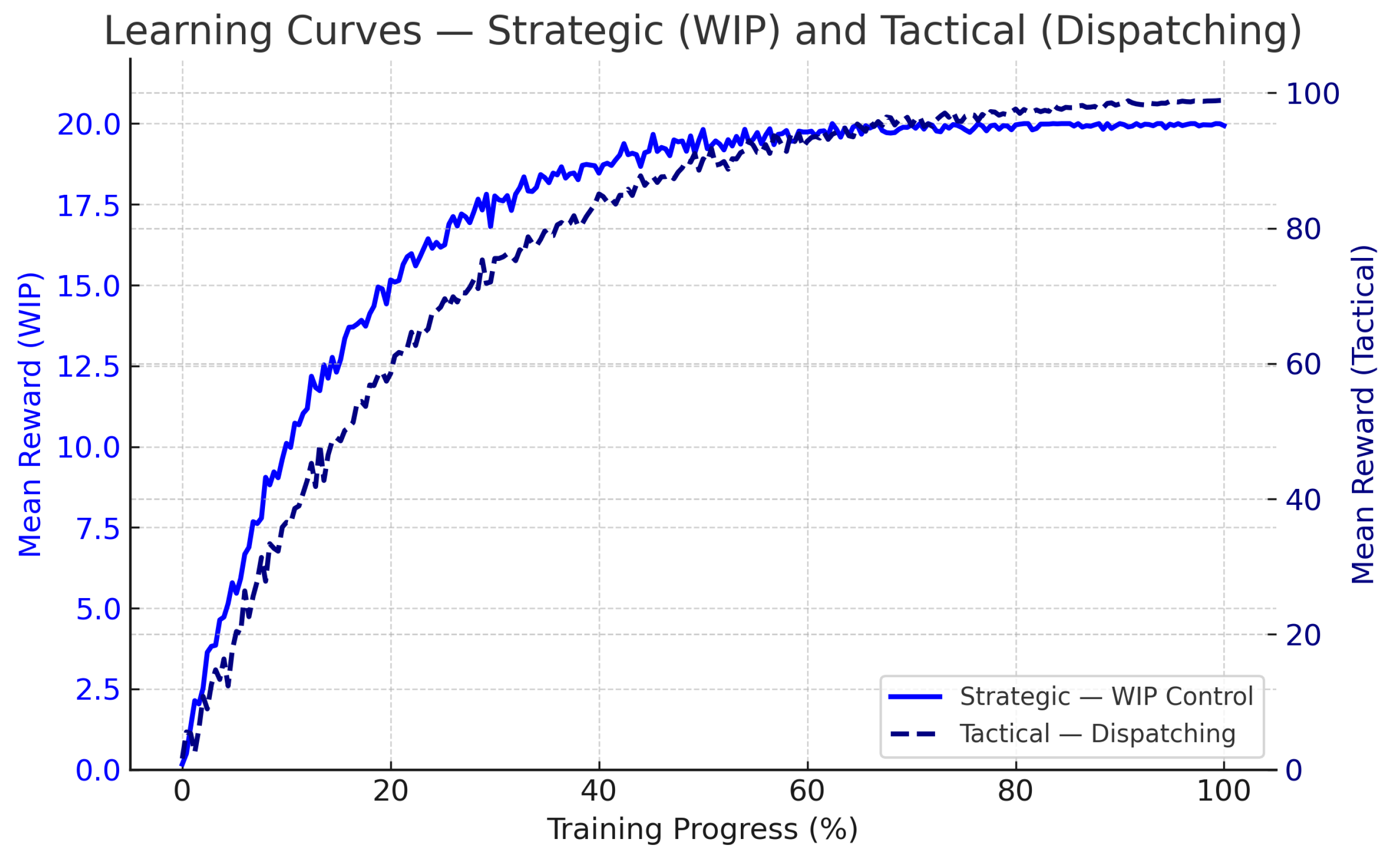 To enable a direct visual comparison between the agents, the learning curves are expressed as Training Progress (%), where 0% corresponds to the beginning of training and 100% to the completion of the respective episode budget. This normalisation accounts for the distinct activation frequencies of the two agents: the strategic agent operates on a periodic, time-driven schedule, whereas the tactical agent is invoked only upon ’MachineFreed’ events.