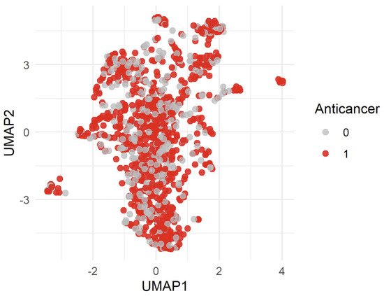Uniform Manifold Approximation and Projection (UMAP). Each point represents a single compound from the DrugBank dataset, projected based on its transcriptomic profile. Points are color-coded according to their known classification: red indicates compounds annotated as anticancer, while gray denotes all other drugs. 0 = non-anticancer drug, 1 = anticancer drug.