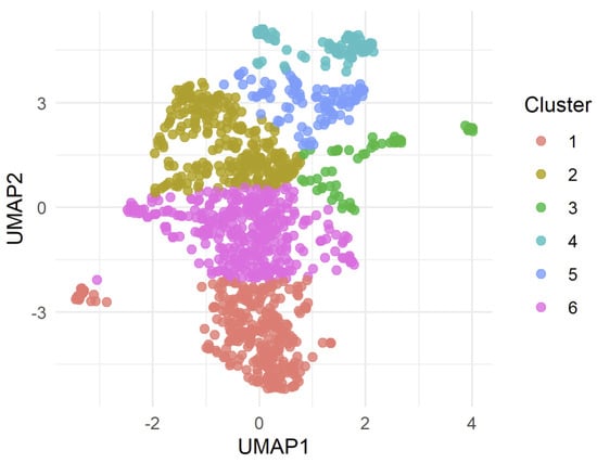 To explore potential substructure in the UMAP embedding, we applied k-means clustering to the two-dimensional UMAP, specifying six clusters. The resulting cluster assignments are shown in Figure 2, where each color represents a distinct cluster.