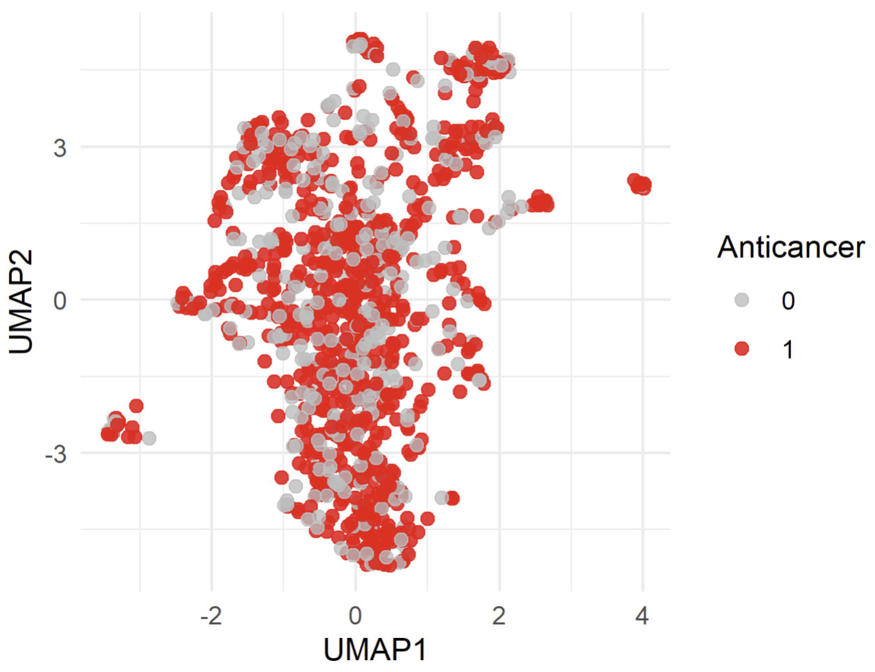 The UMAP reveals that anticancer and non-anticancer compounds are largely intermixed in the reduced space. No clear clusters or separable regions corresponding to the two classes emerge from the embedding. This suggests that, in the reduced UMAP space, the transcriptional signatures of anticancer compounds are not trivially distinguishable from those of non-anticancer compounds.