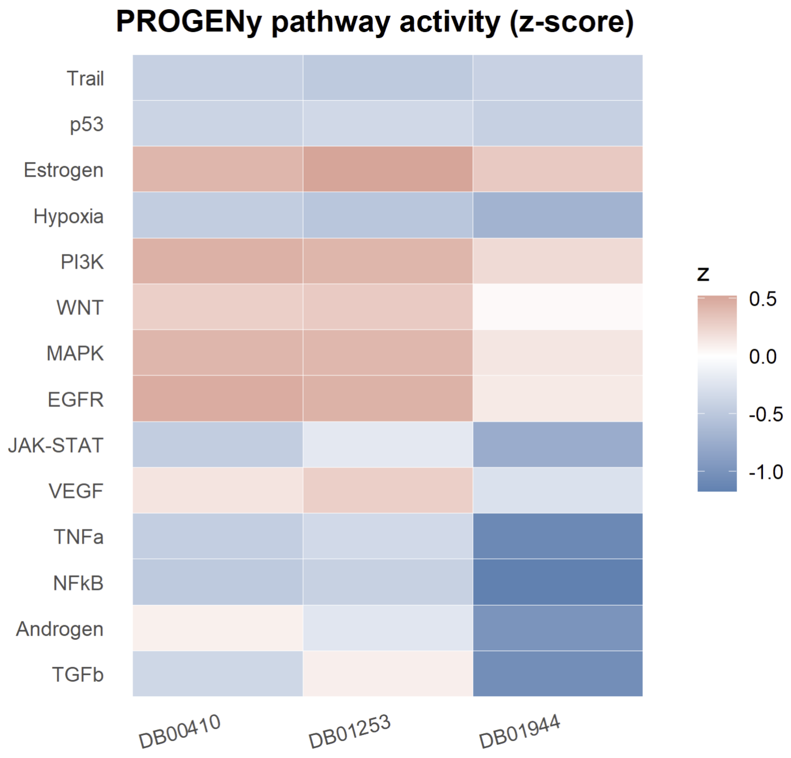 Pathway activities were computed with progeny, which standardizes genes internally and uses all available genes to estimate activities for 14 canonical signaling pathways (e.g., Androgen, EGFR, Estrogen, Hypoxia, JAK–STAT, MAPK, NF-κB, PI3K, p53, TGF-β, TNF-α). The function returns a continuous activity score for each pathway and drug, where higher values indicate higher inferred pathway activation.