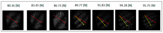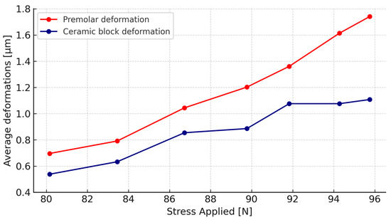 | Forces Applied [N] | Premolar Deformation [µm] | Ceramic Block Deformation [µm] | ||