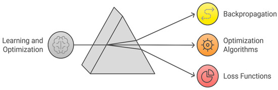 Deep learning, a subfield of machine learning, extracts meaning from data through multiple layers of artificial neural networks. With the growth of big data and computational power in recent years, deep learning methods have achieved remarkable results in areas such as image processing, natural language processing, and speech recognition. Artificial neural networks, inspired by biological neural networks, consist of an input layer, one or more hidden layers, and an output layer [19]. They employ activation functions such as Sigmoid, ReLU (Rectified Linear Unit), and tanh to determine the output of neurons [20]. Deep neural networks (DNNs) are neural networks with more than one hidden layer, where increased depth enhances the model’s ability to learn complex functions [19]. Specialized architectures include convolutional neural networks (CNNs), which are primarily used for image data and employ convolutional layers to capture spatial relationships [21], and recurrent neural networks (RNNs), which are designed for time series and sequential data and are capable of retaining past information [21]. The learning and optimization process involves backpropagation, which updates the weights by propagating the error signal backward through the network [19]. Optimization algorithms such as stochastic gradient descent (SGD), Adam, RMSprop, Adagrad, and Nadam are used to accelerate and improve the learning process [22]. To evaluate model performance, loss functions such as cross-entropy (CE) and mean squared error (MSE) are commonly employed [22]. The schematic structure of the learning and optimization process is presented in Figure 2.