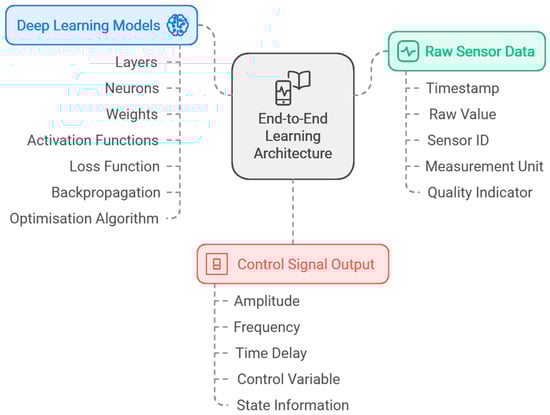The ability of vehicles to accurately localize and generate maps of their surroundings is a fundamental prerequisite for autonomous driving. Image-based localization methods, enhanced by deep learning, enable vehicles to self-localize by matching live images with previously known maps [31]. SLAM algorithms are increasingly integrated with deep learning to achieve more robust and faster mapping. In particular, automatic feature extraction through deep learning significantly enhances SLAM performance [32]. SLAM enables an autonomous vehicle operating in an unfamiliar environment to estimate its own location while simultaneously generating a map of its surroundings. Image-based SLAM, for example, relies on camera data to accomplish this task. Under dynamic traffic conditions, autonomous vehicles must make accurate decisions and generate appropriate movement plans to ensure safe and efficient operation. In the field of path planning and motion control, deep reinforcement learning (DRL) enables vehicles to learn optimal movement strategies [33]. Furthermore, recurrent neural networks (RNNs), and particularly long short-term memory (LSTM) networks, are effective in predicting the behavior of other traffic participants using time series data. By anticipating possible scenarios in advance, these models enable vehicles to make safer decisions [34]. Combining data from different sensors allows vehicles to perceive their surroundings more accurately and comprehensively. Multimodal deep learning approaches enhance detection performance by processing data from cameras, LiDAR, radar, and ultrasonic sensors using deep neural networks (DNNs) [35]. Some studies focus on end-to-end learning models that generate control commands directly from raw sensor data (Figure 3). These approaches enable deep neural networks (DNNs) to learn vehicle control signals directly from image data. For example, one model was developed to learn vehicle control by mimicking the behavior of human drivers [36].