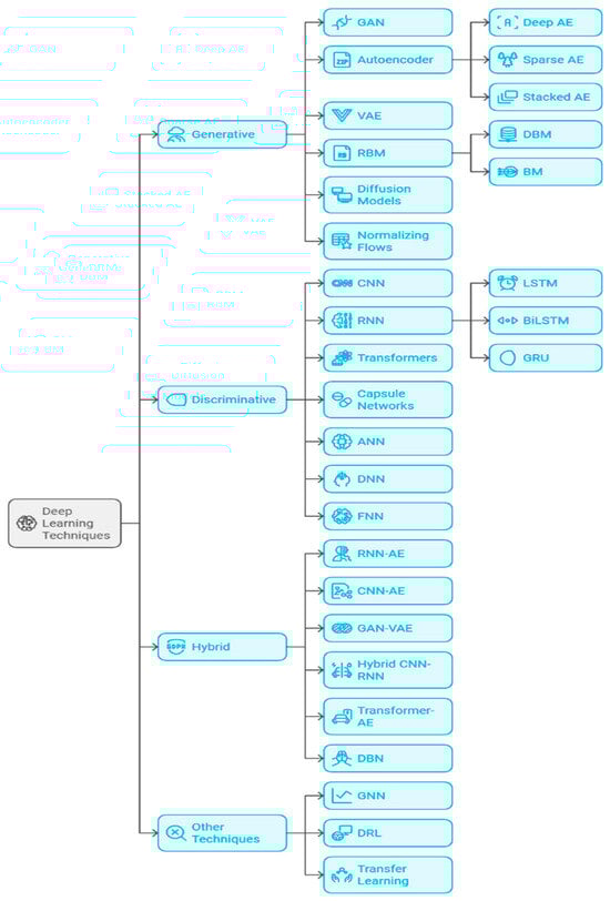 All these methods fall within the domain of deep learning and are capable of automatically extracting and learning features from data. An overview of these techniques is presented in Figure 5, while the deep learning methods employed in the reviewed studies are summarized in Table 2.