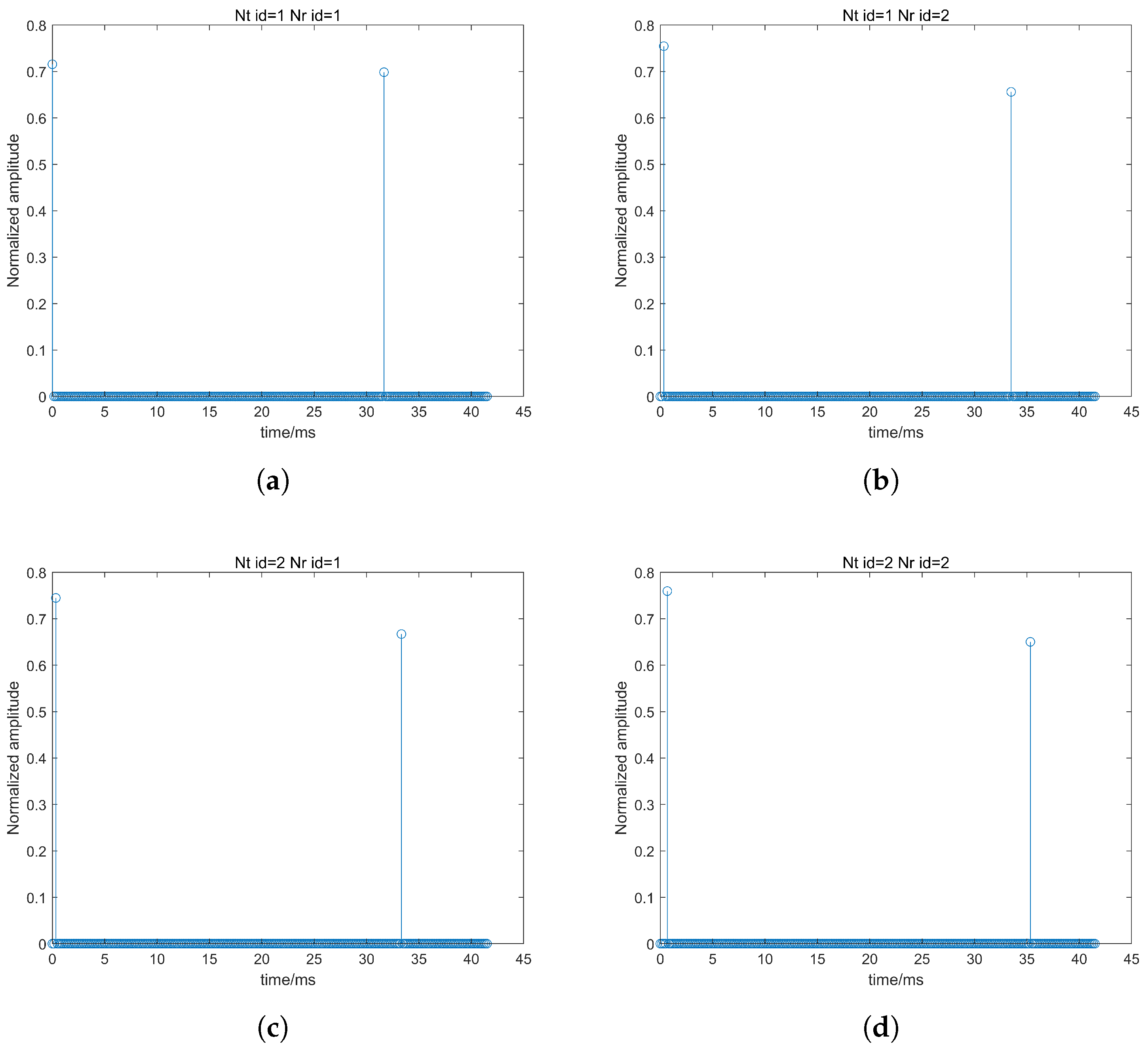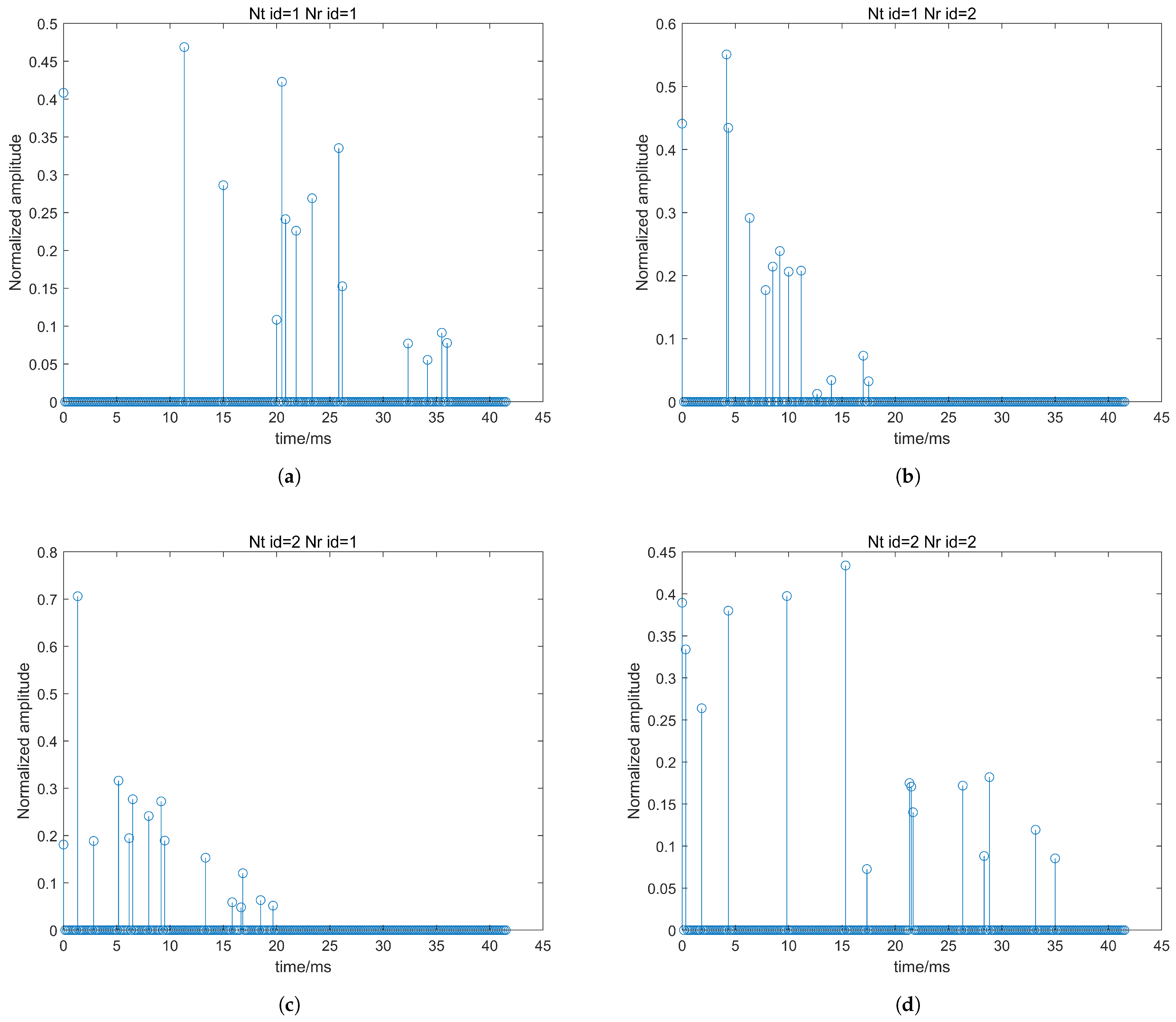 24]. Channels between each transmitter–receiver pair are mutually independent, with each channel comprising 15 randomly generated multipath components. The inter-path delays follow an exponential distribution with a mean of 2 ms, while path amplitudes follow a Rayleigh distribution. For each signal-to-noise ratio (SNR), 100 Monte Carlo trials are conducted. In each Monte Carlo trial, a new set of MIMO statistical channels is generated. A typical channel realization is shown in