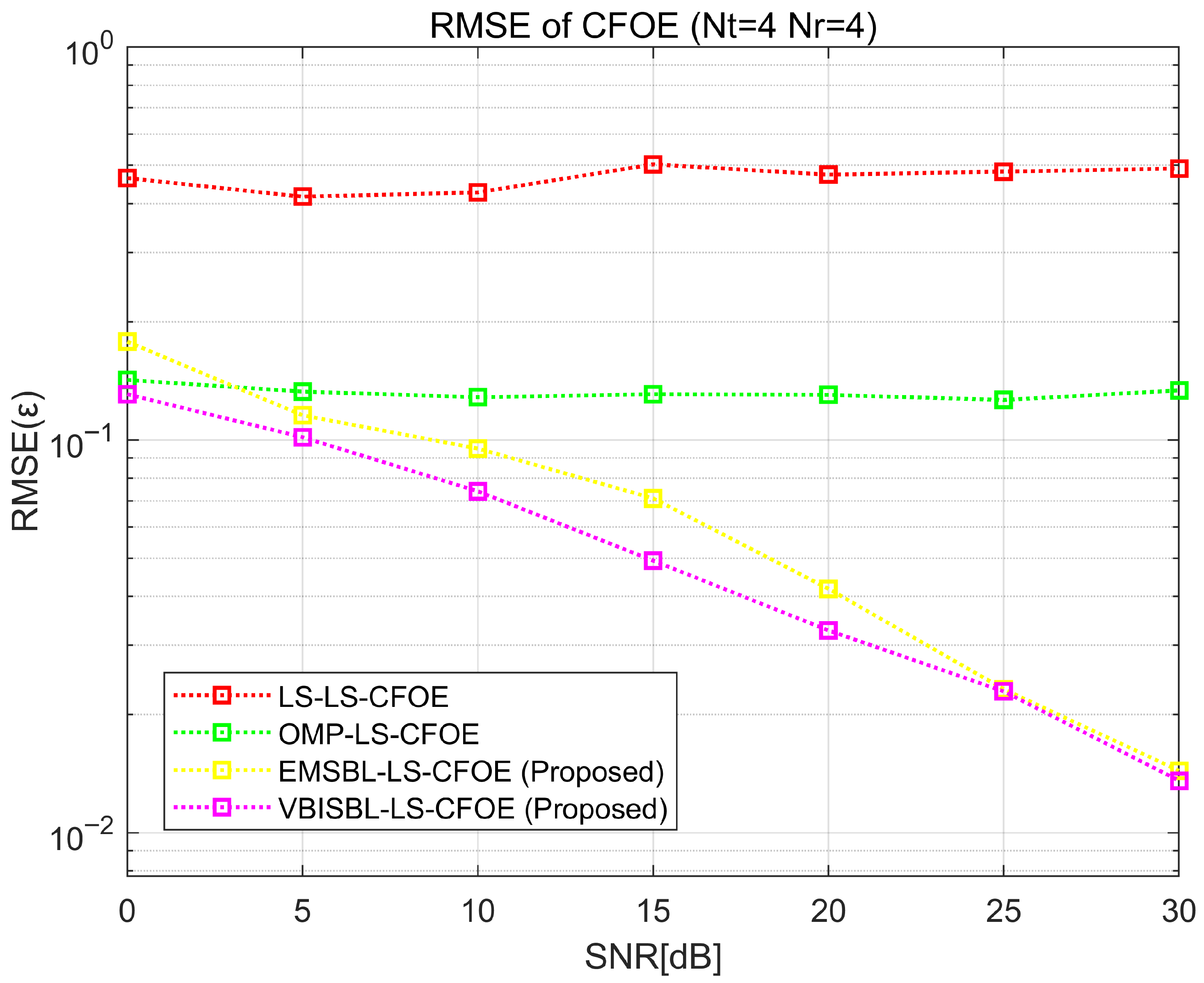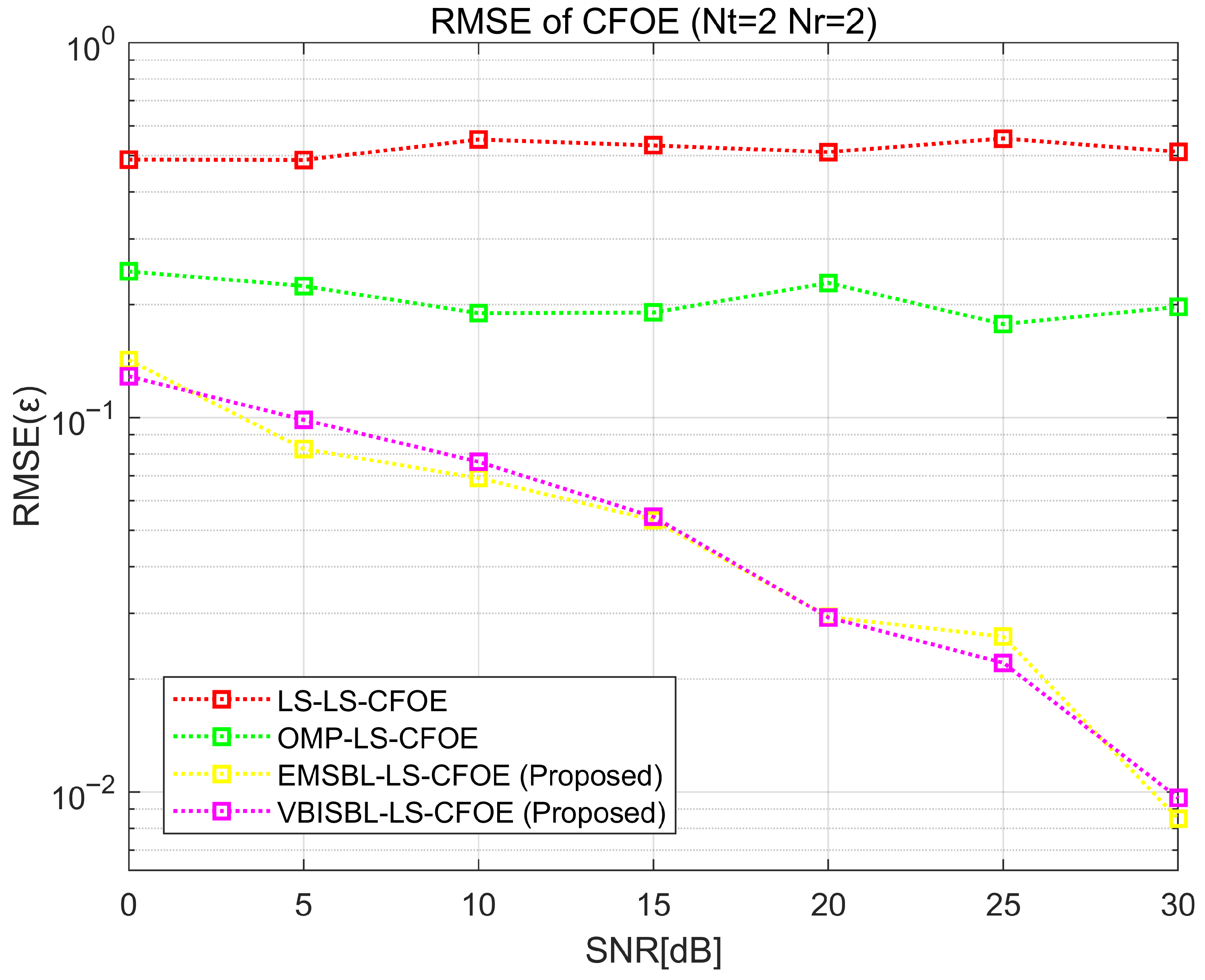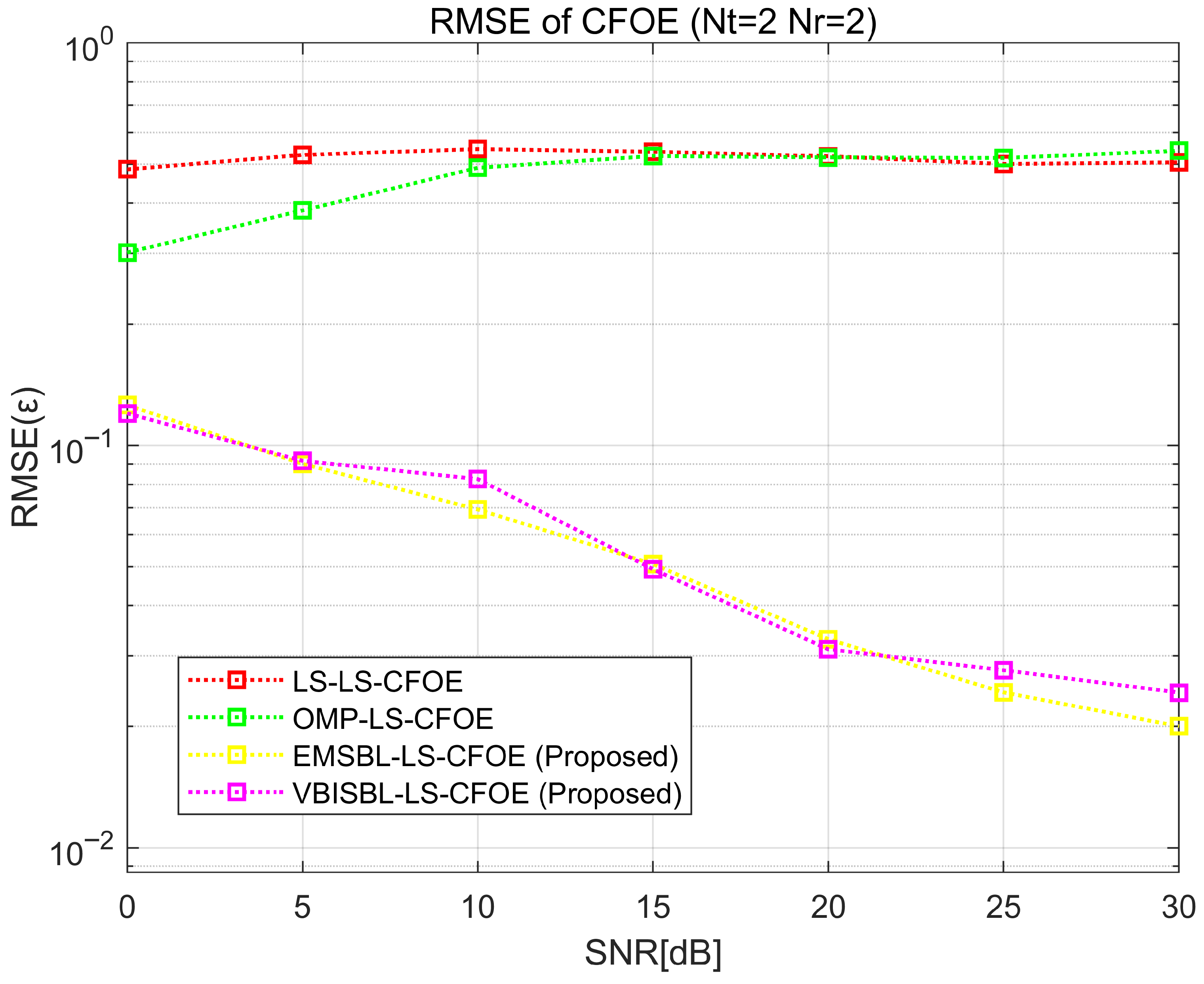 Figure 9, the CFO estimation performance of our proposed scheme improves as the number of pilot subcarriers increases. However, when the number of pilot subcarriers is too low, the CFO estimation performance degrades due to a lack of measurement data required for the SBL algorithms. As shown in
