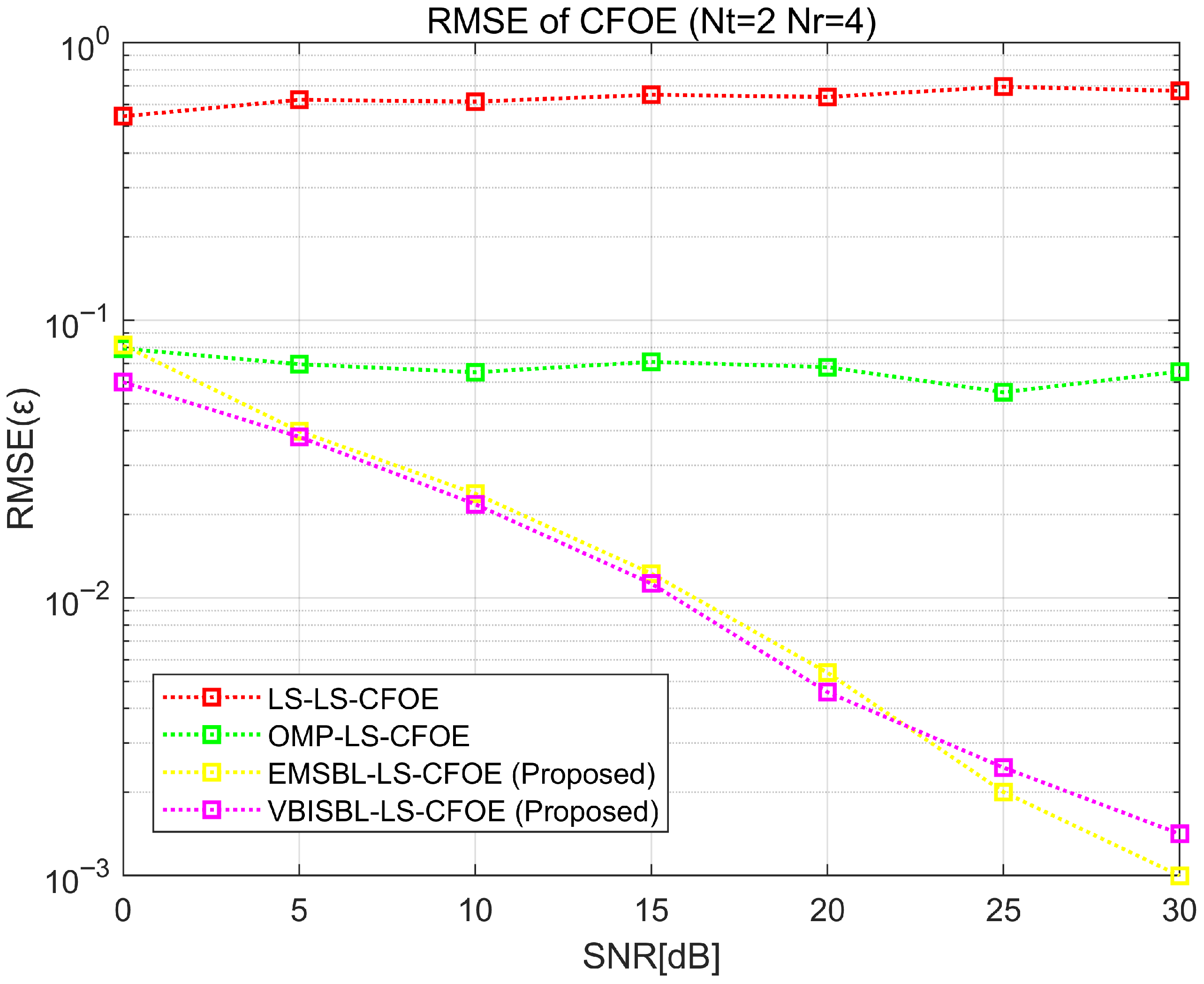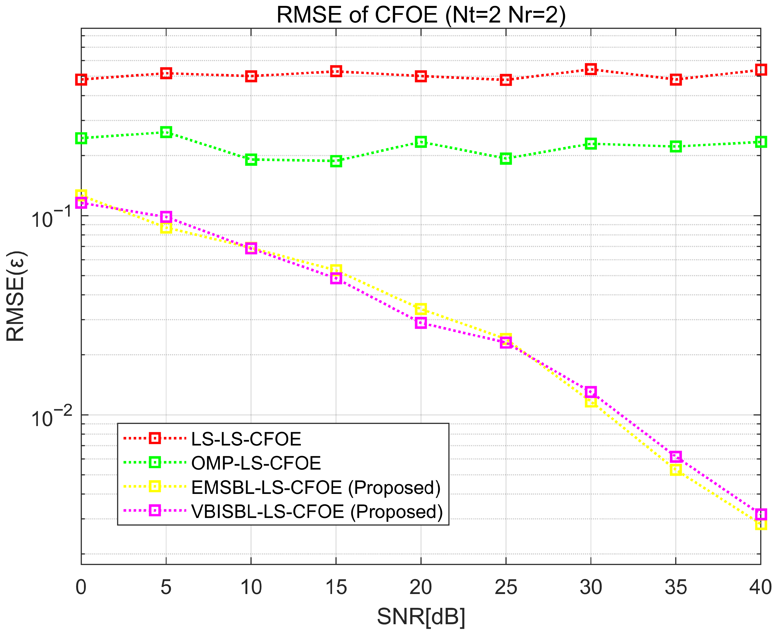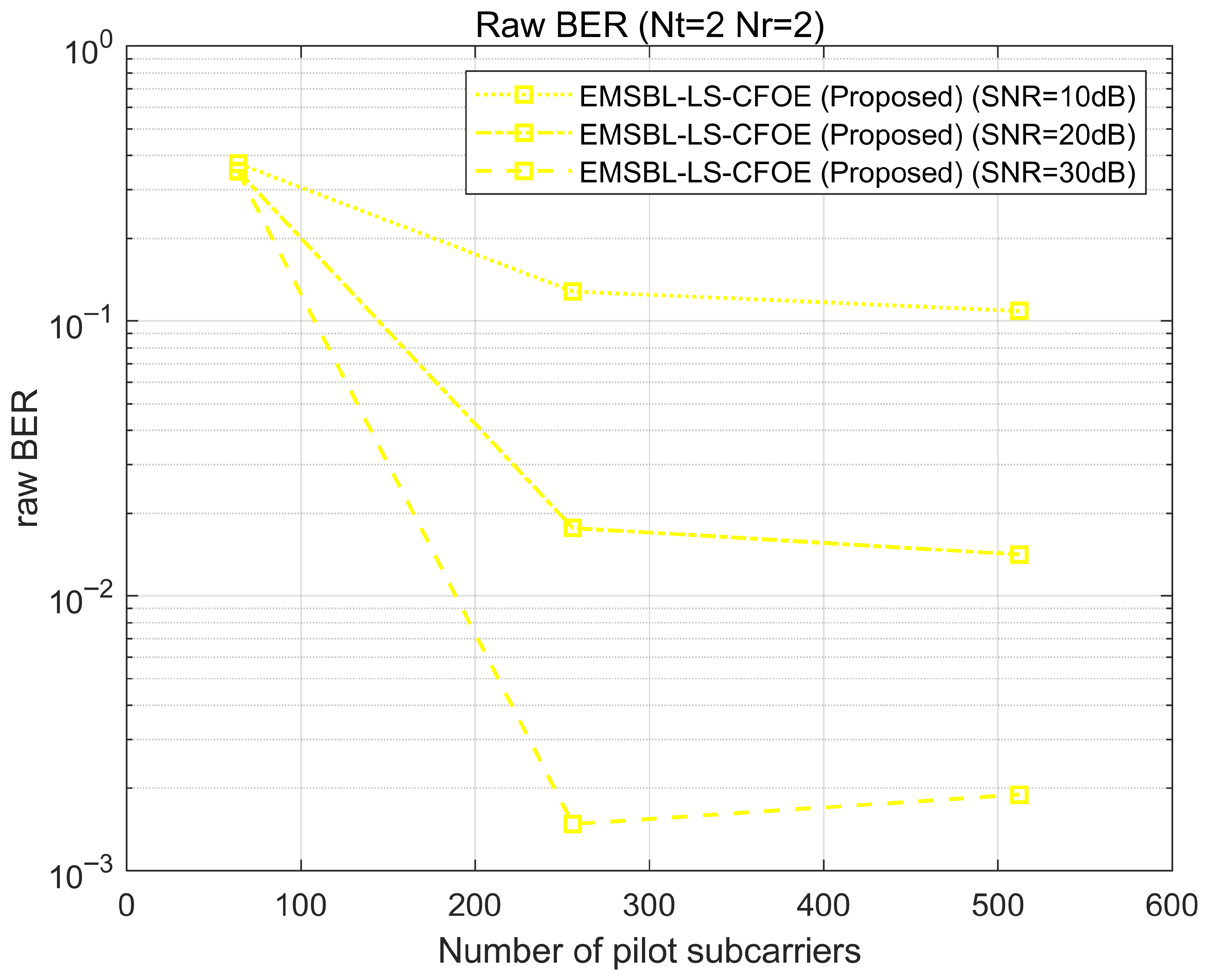 Figure 9, the CFO estimation performance of our proposed scheme improves as the number of pilot subcarriers increases. However, when the number of pilot subcarriers is too low, the CFO estimation performance degrades due to a lack of measurement data required for the SBL algorithms. As shown in