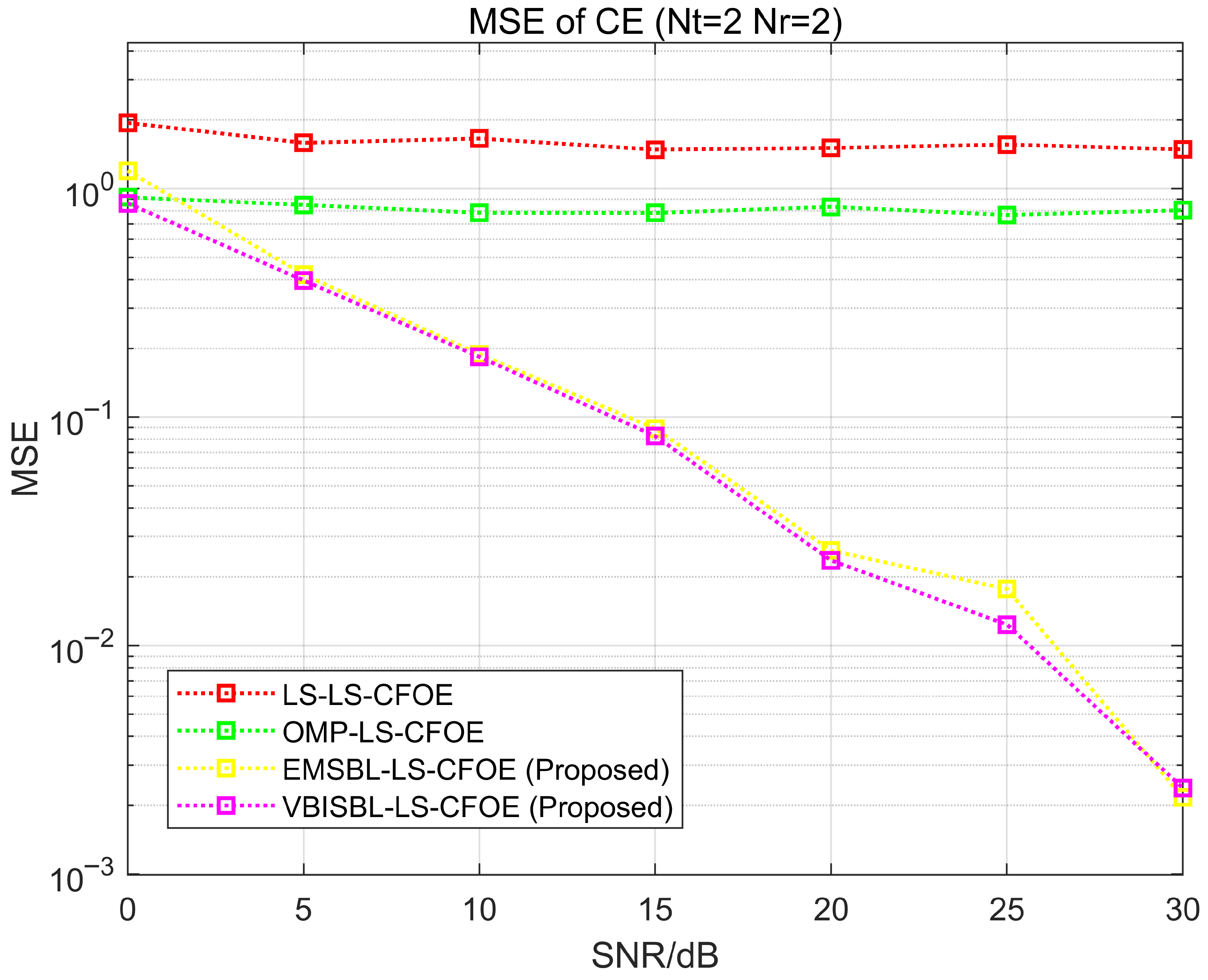 Figure 13, the CFO estimation performance for the 2 × 4 MIMO configuration is superior to that of the 2 × 2 MIMO configuration at the same SNR. This improvement is attributed to the spatial diversity gain, which enhances the performance of the tentative equalization, thereby leading to more accurate CFO estimation. Furthermore, the improved CFO estimation accuracy subsequently results in better channel estimation performance for the 2 × 4 MIMO configuration compared to the 2 × 2 MIMO configuration case, as shown in
