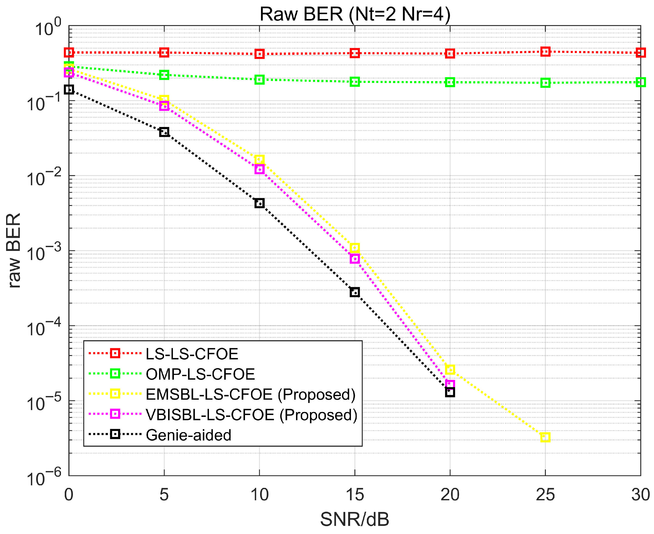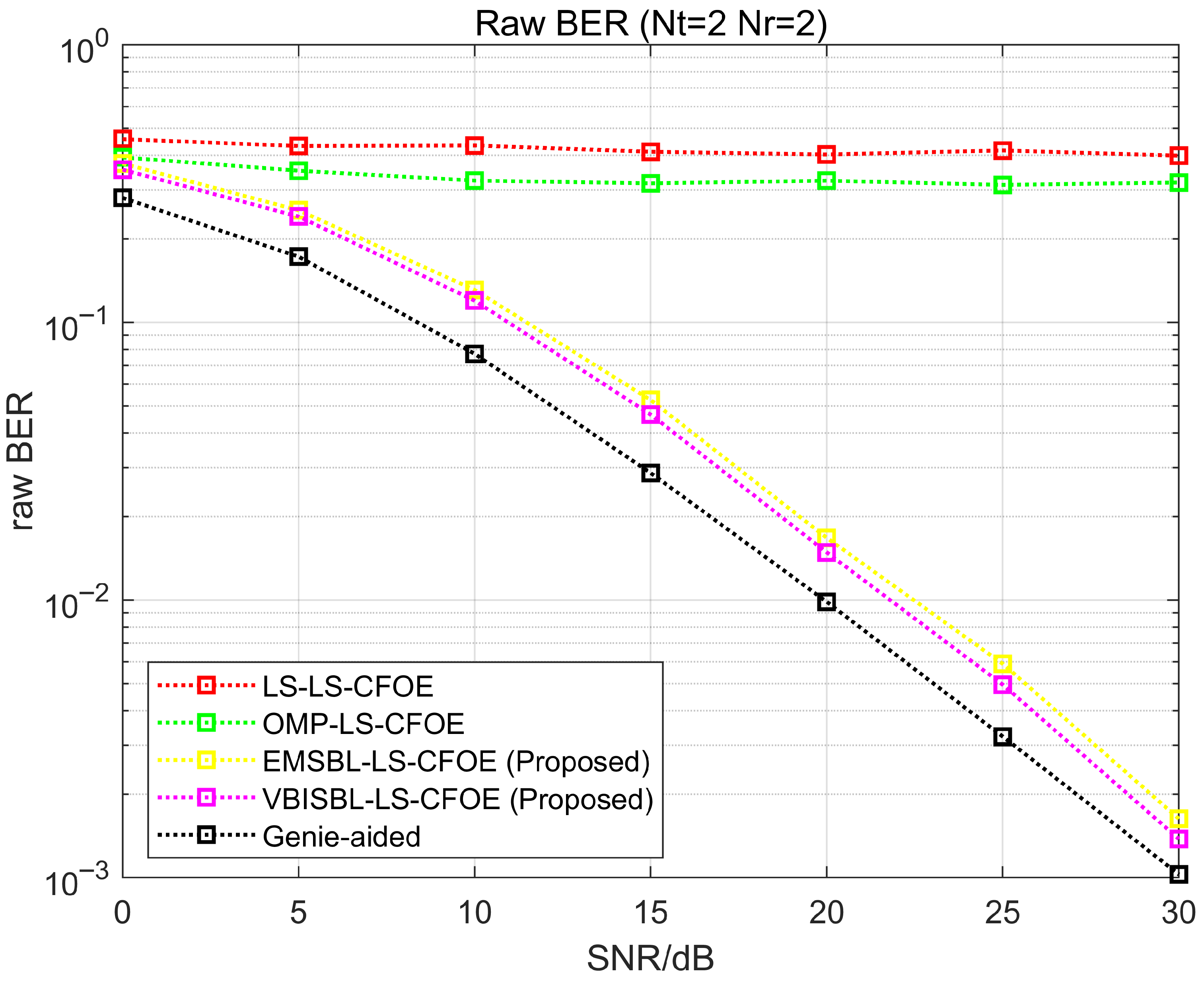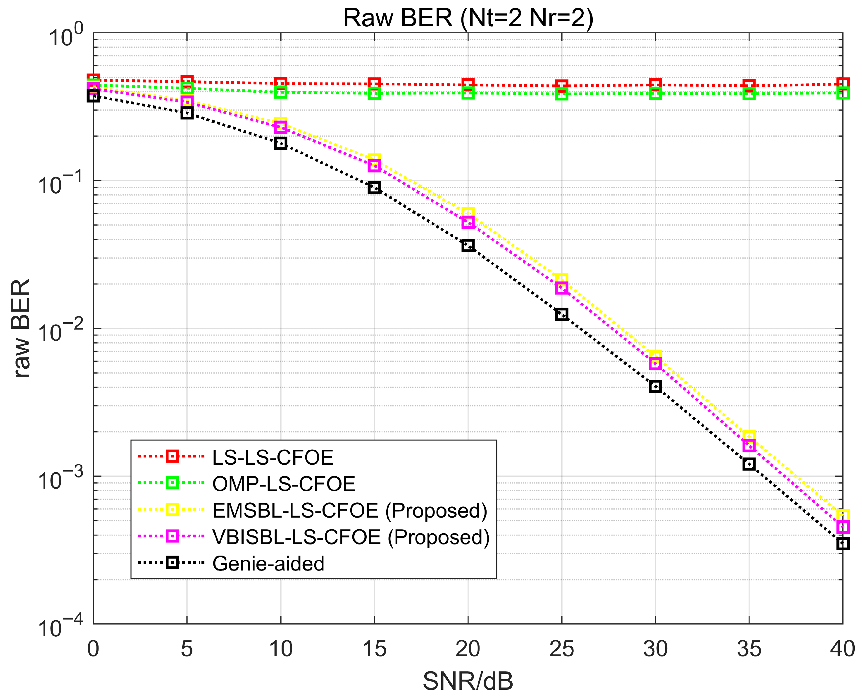 Figure 5, the demodulation bit error rates of communication systems based on our proposed EMSBL-LS-CFOE and VBISBL-LS-CFOE schemes are, across the entire SNR range, close to that of the genie-aided system with perfect CFO estimation and perfect channel state information. Even without specialized optimization of other components in a communication system, our results demonstrate promising BER performance. In this 2 × 2 MIMO system configuration, a satisfactory BER on the order of