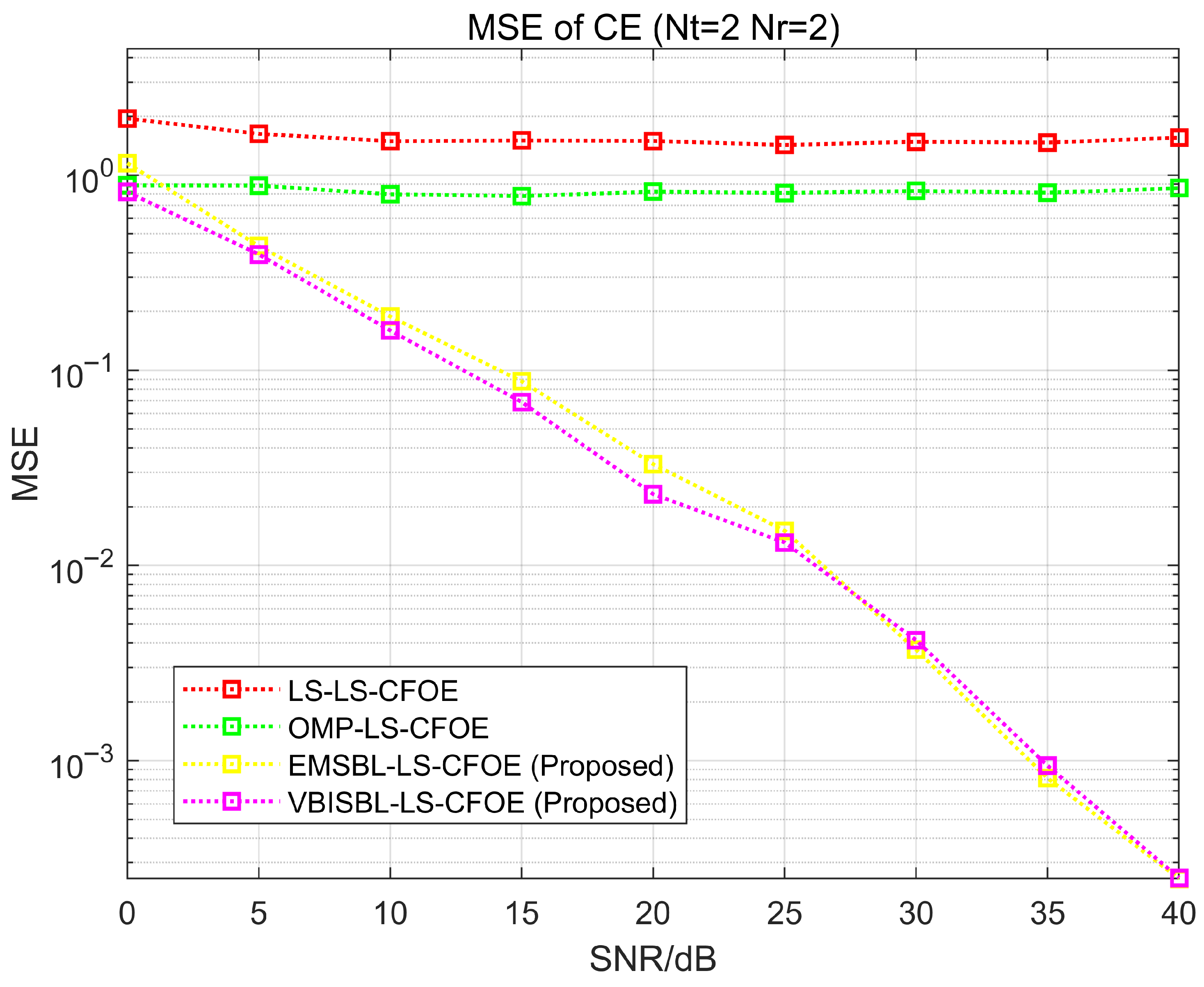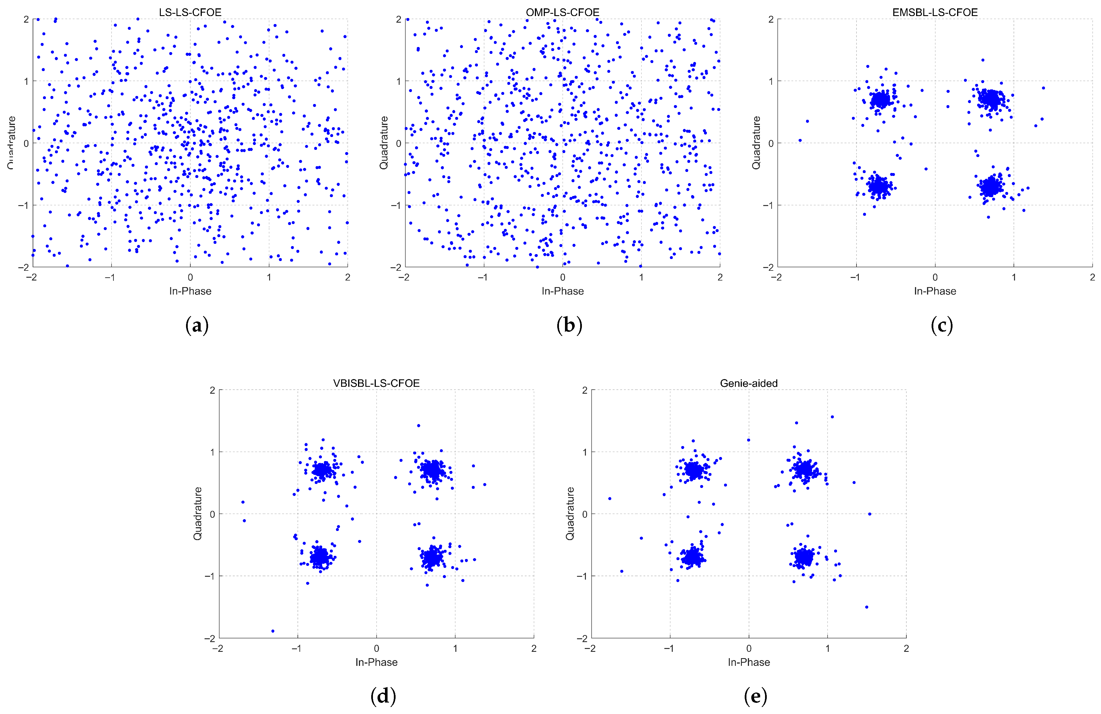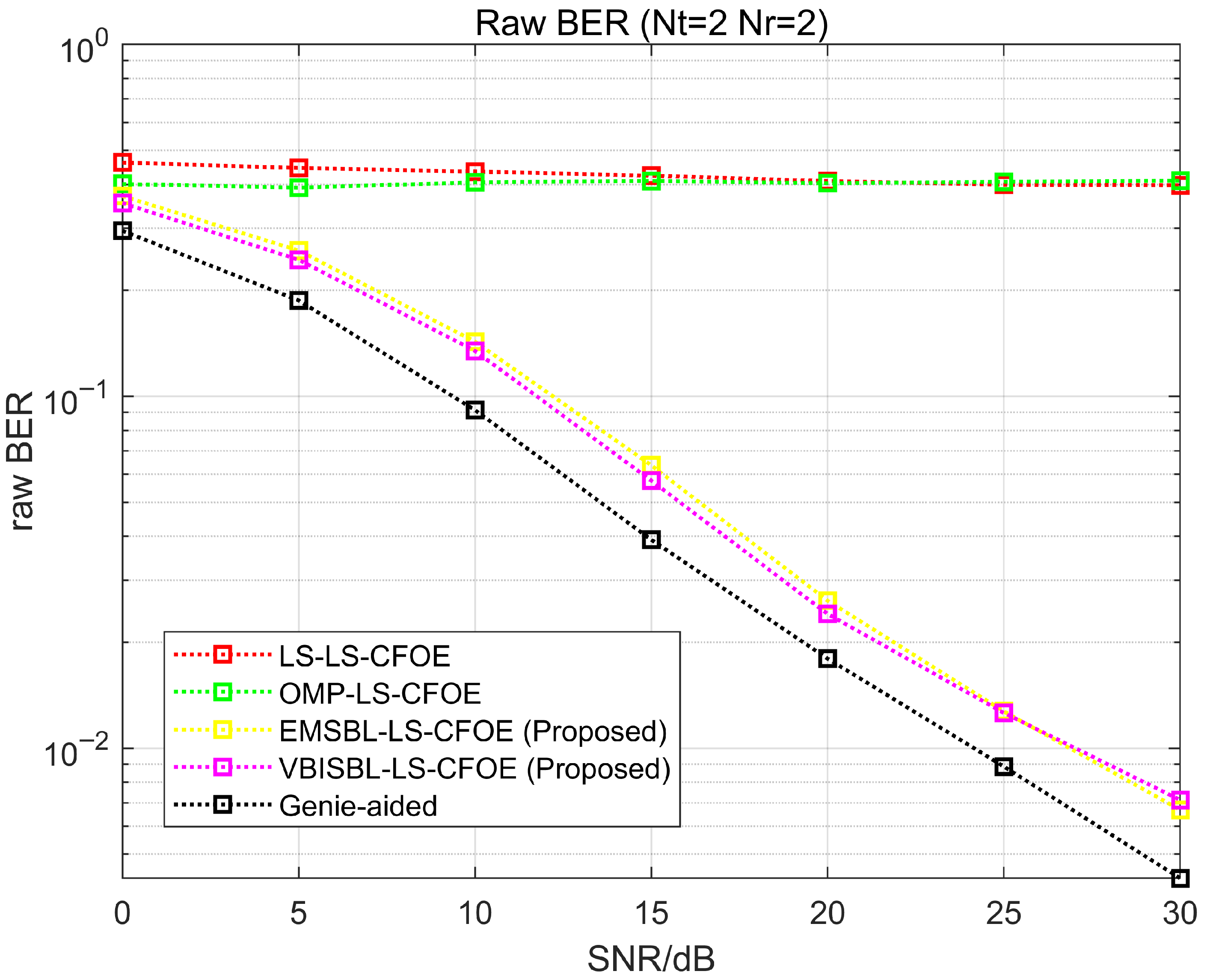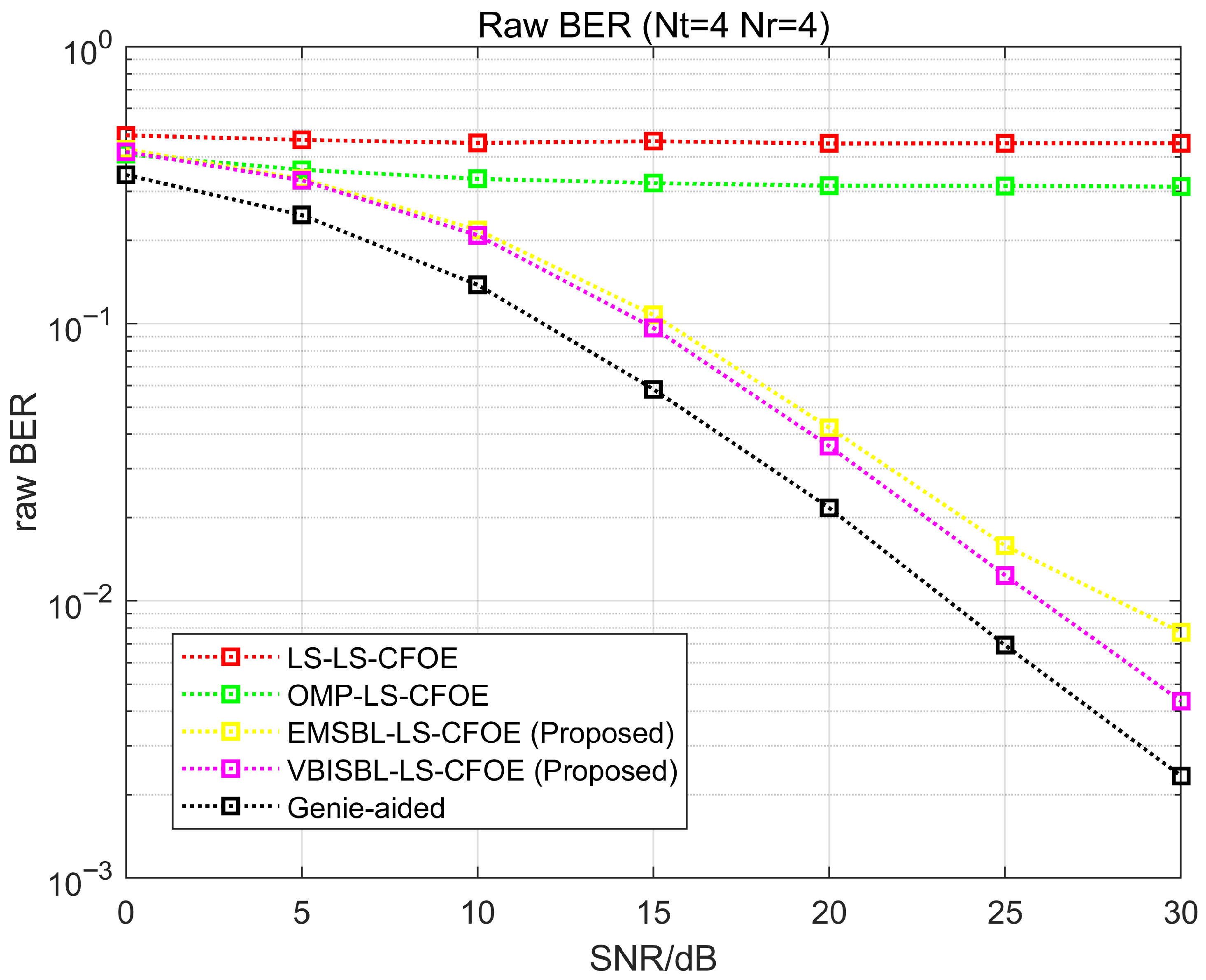 Figure 5, the demodulation bit error rates of communication systems based on our proposed EMSBL-LS-CFOE and VBISBL-LS-CFOE schemes are, across the entire SNR range, close to that of the genie-aided system with perfect CFO estimation and perfect channel state information. Even without specialized optimization of other components in a communication system, our results demonstrate promising BER performance. In this 2 × 2 MIMO system configuration, a satisfactory BER on the order of