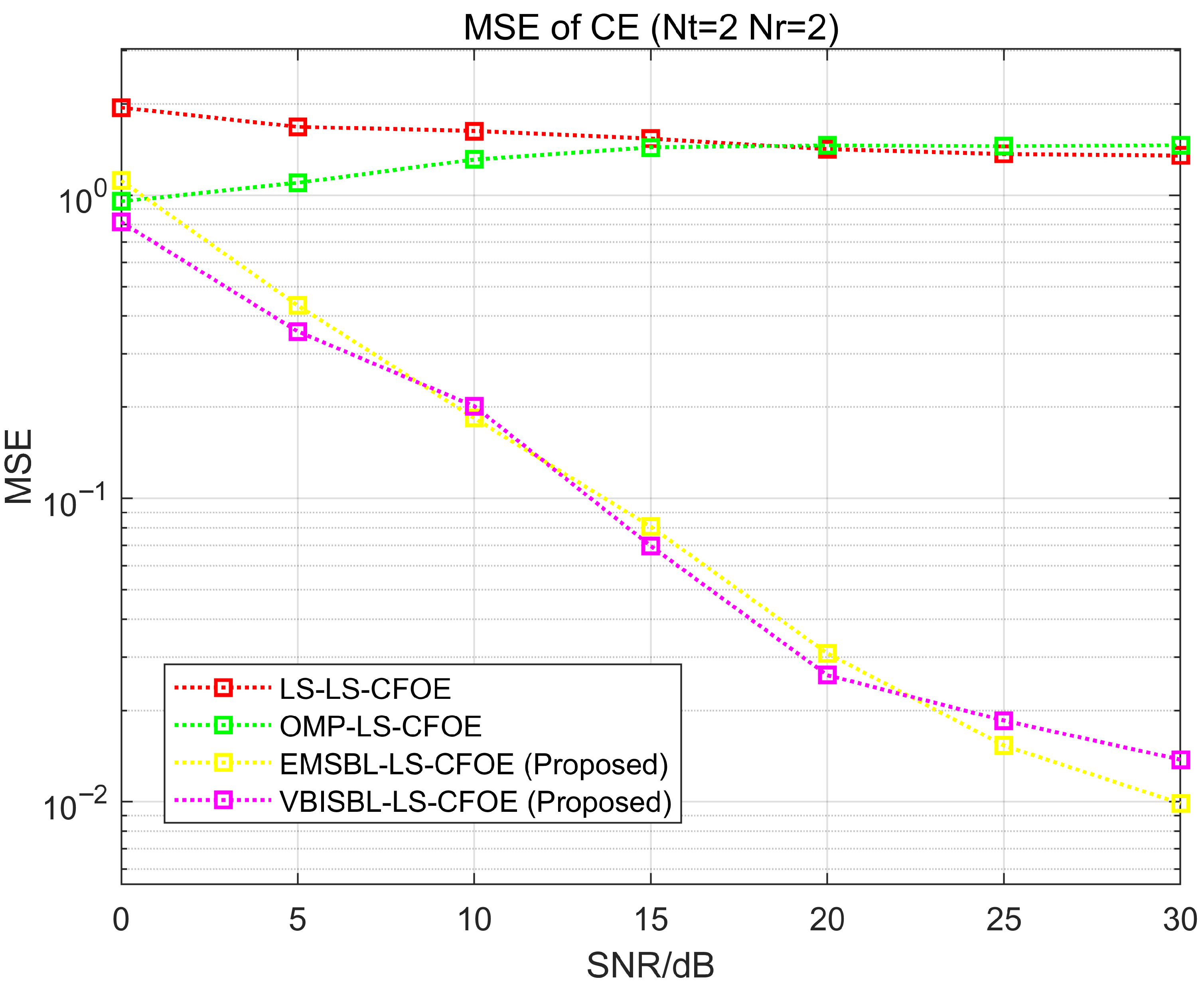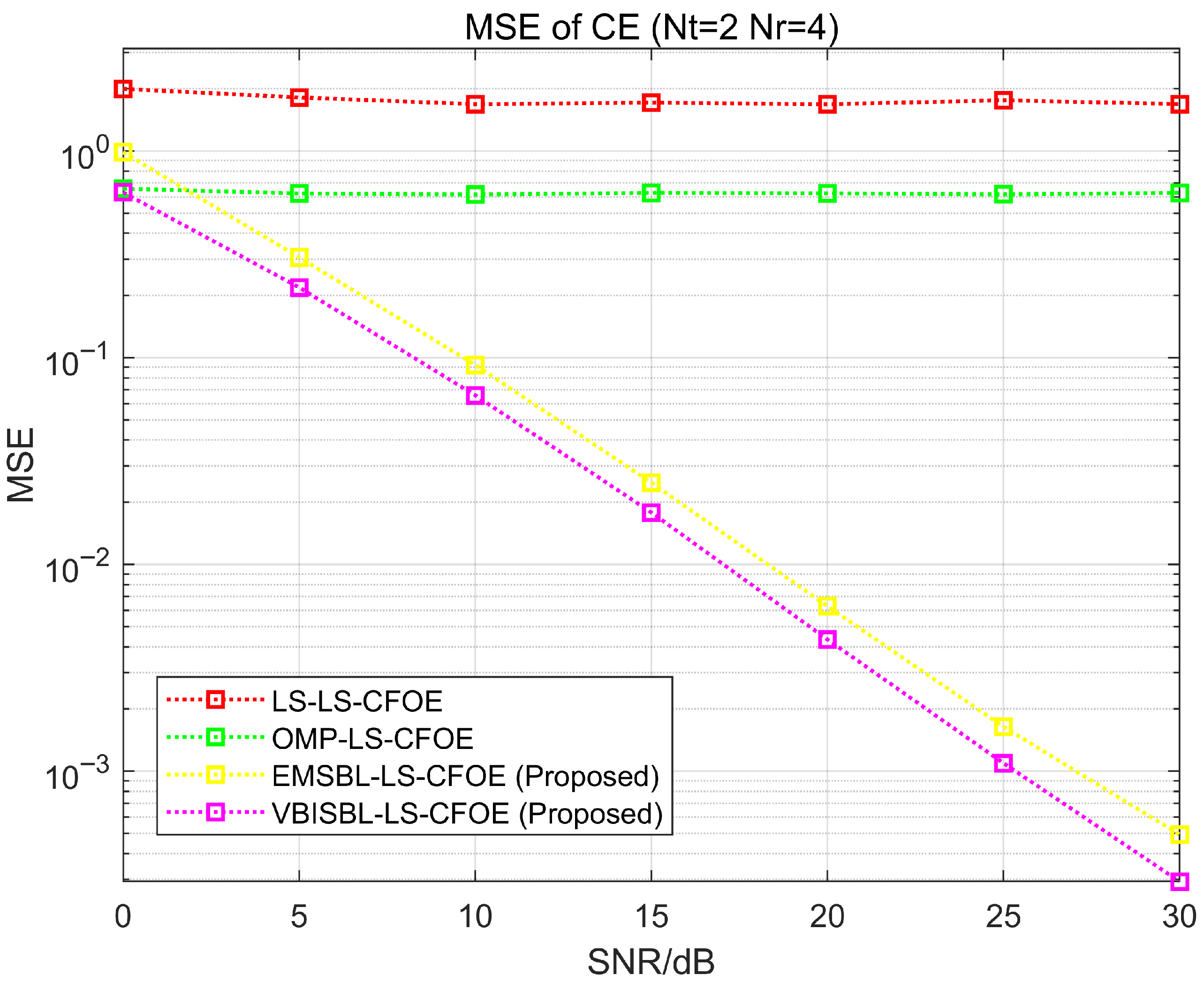 Figure 4, leading to deteriorated CFO estimation performance of the LS-LS-CFOE scheme. The OMP-LS-CFOE scheme introduces the classical sparse reconstruction algorithm OMP for tentative channel estimation. Although OMP exploits prior sparsity to overcome the limitations of LS, the mismatch between the prior sparsity and the actual sparsity results in unsatisfactory tentative channel estimation performance. In contrast, the tentative EM-SBL channel estimation algorithm in our proposed EMSBL-LS-CFOE scheme adapts to the actual sparsity of the channel, achieving desirable tentative channel estimation performance, which consequently leads to improved CFO estimation performance. With lower computational complexity, our proposed VBISBL-LS-CFOE scheme achieves comparable or even slightly better CFO estimation performance than the EMSBL-LS-CFOE scheme. This is because the VBI-SBL channel estimation technique decomposes the high-dimensional channel into
