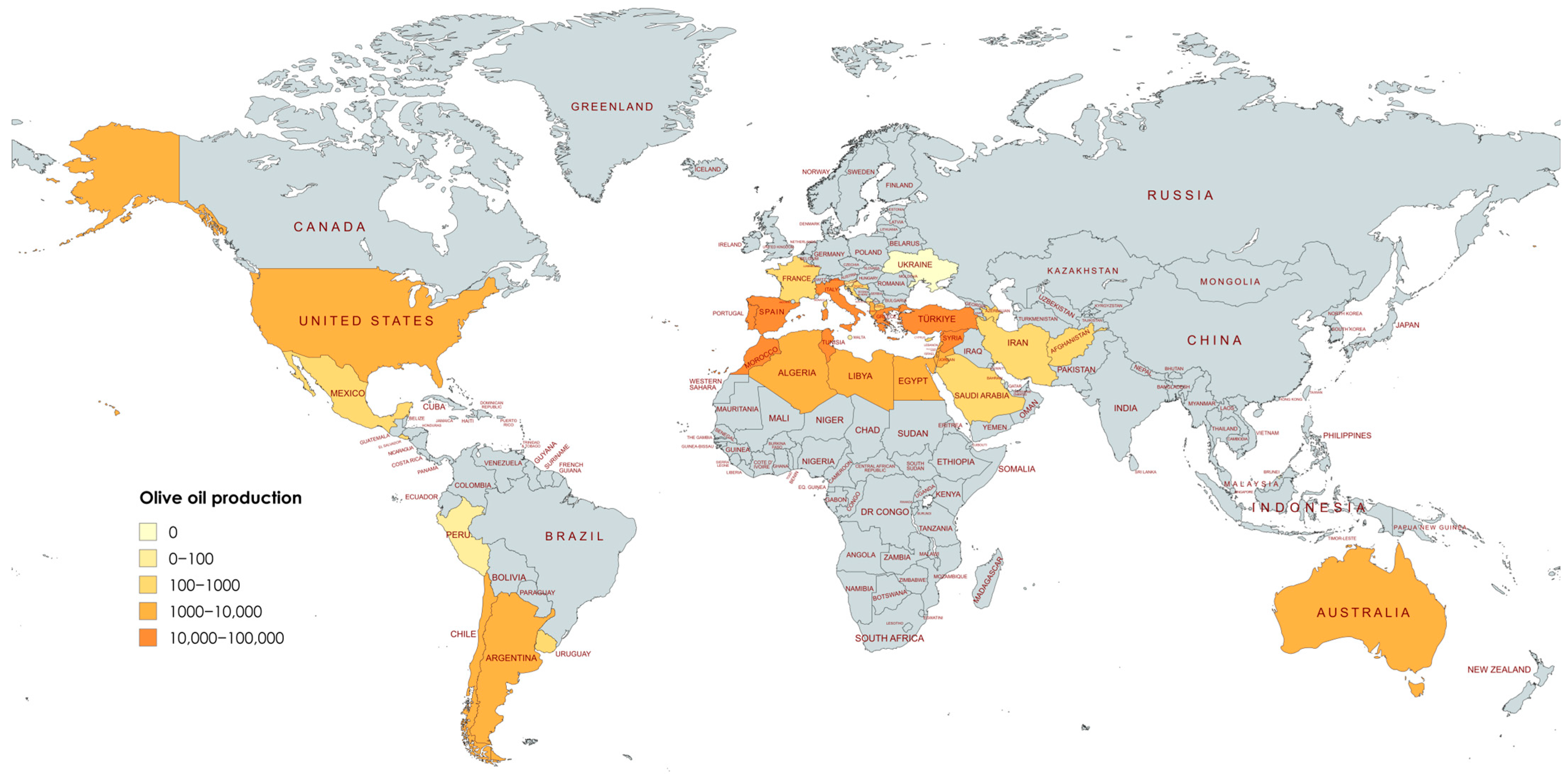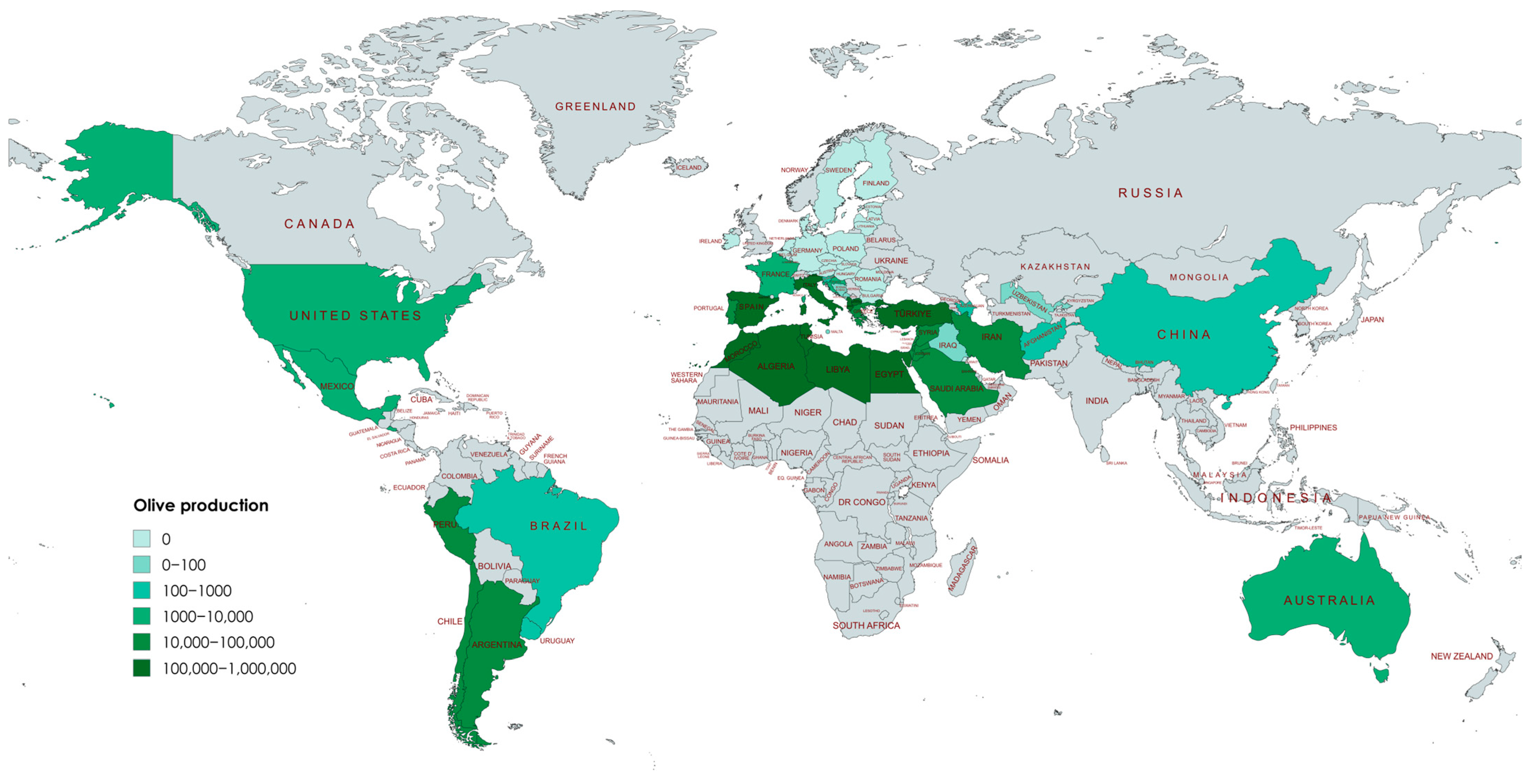 - IOC. IOC Statistics Dashboard. 2022–2025. Available online: www.internationaloliveoil.org/what-we-do/statistics/ (accessed on 15 August 2025).