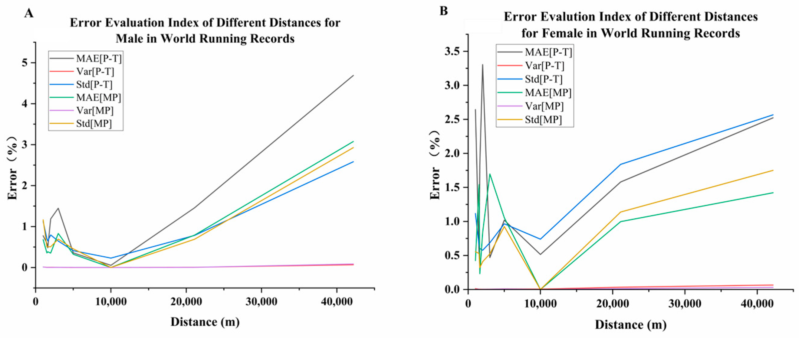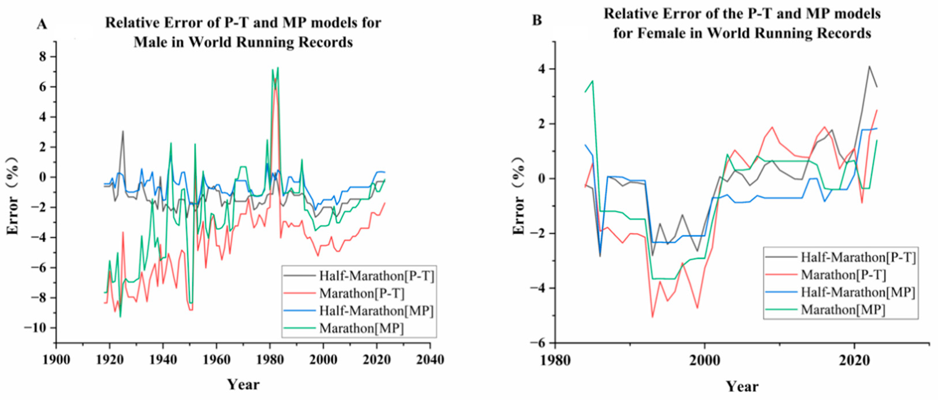 - World Running Records (WRR): The dataset is derived directly from the authoritative IAAF Handbook [27], which provides us with running world records for nine different distances ranging from the 1000-m sprint to the full marathon, with records for males ranging from 1918 to 2023 and for females ranging from 1984 to 2023. This choice attempts to fully cover a wide range of results in terms of short-distance explosive power and long-distance endurance, in addition to guaranteeing the validity and authenticity of the data.