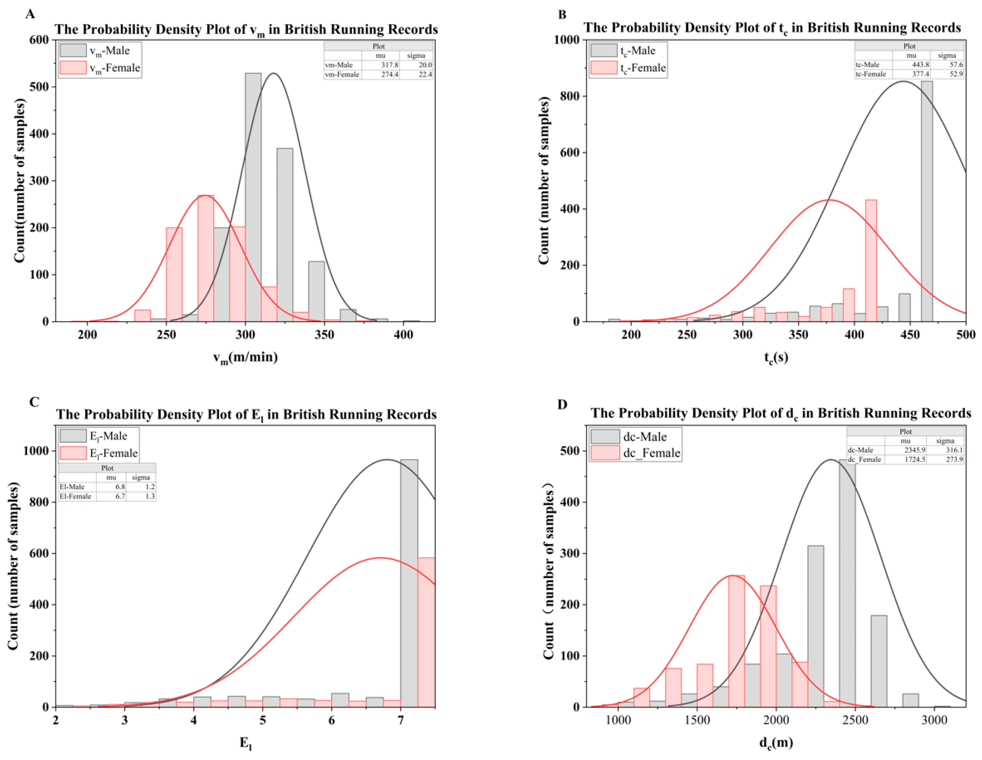 - British Runners Records (BRR): To delve deeper into the performance characteristics of the average runner, we have selected data from the BRR database from a widely used online resource (http://www.thepowerof10.info/ (accessed on 15 March 2024)) [28]. We focus on the analysis of five representative race distances—5 km (5 K), 10 km (10 K), 10 miles (10 M), half marathon (HM) and full marathon (Mar). Based on this, we select for runners who had raced at all five distances to construct an exhaustive dataset of 2079 UK runners. The dataset is relatively gender balanced, with 38.3% female and 61.7% male.