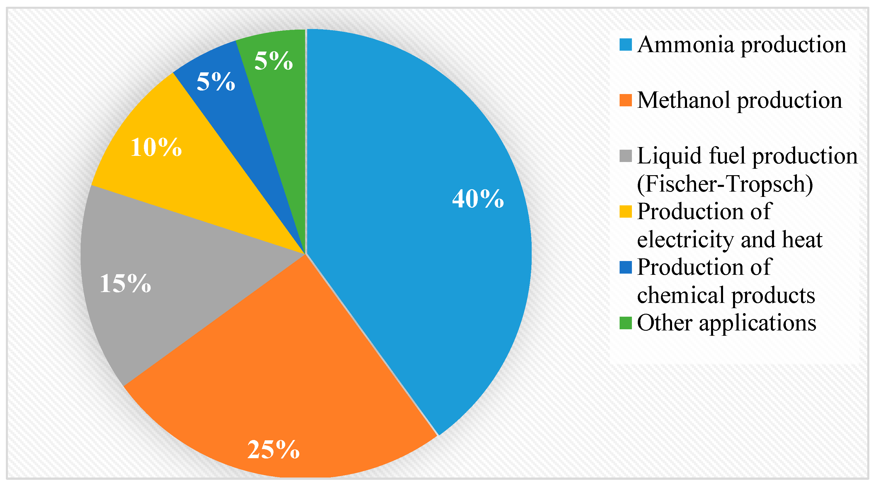 - Chavando, J.A.M.; Silva, V.; Caballero, C.G.T.; Cardoso, J.S.; Tarelho, L.A.C.; Eusébio, D. Future Prospects and Industrial Outlook of Syngas Applications. In Advances in Synthesis Gas: Methods, Technologies and Applications; Elsevier: Amsterdam, The Netherlands, 2023; pp. 427–463. ISBN 978-0-323-91878-7. [Google Scholar]