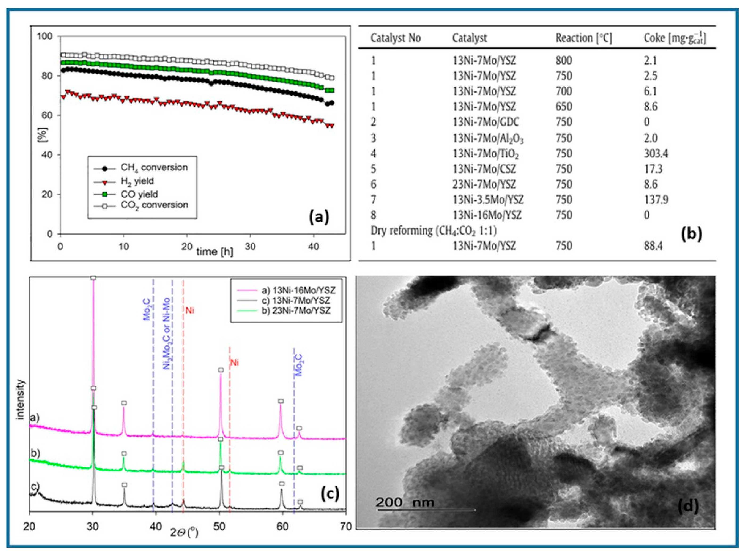 - Zhang, X.; Deng, J.; Pupucevski, M.; Impeng, S.; Yang, B.; Chen, G.; Kuboon, S.; Zhong, Q.; Faungnawakij, K.; Zheng, L.; et al. High-Performance Binary Mo–Ni Catalysts for Efficient Carbon Removal during Carbon Dioxide Reforming of Methane. ACS Catal. 2021, 11, 12087–12095. [Google Scholar] [CrossRef]