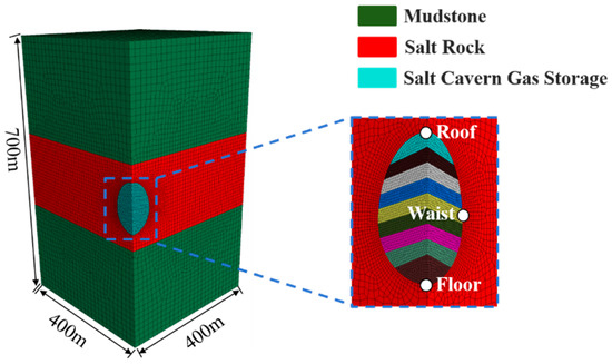 Based on the geological data from the Jintan area in Jiangsu, a proposed underground SCGS is located within a 200 m thick salt rock layer, with 150 m of mudstone as the cap rock and base rock. A quarter of the numerical simulation model is established as shown in Figure 3. The model has a length and width of 400 m, and the solution mining area is divided into 9 sections from bottom to top, mined layer by layer. The overlying rock layer load is simplified as a uniform load applied to the top surface of the model, while normal displacement constraints are applied to the other surfaces.