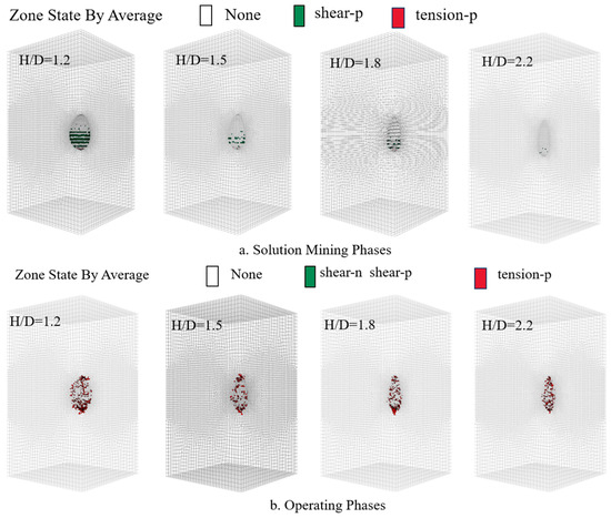 Figure 6a shows the distribution of the surrounding rock plastic zone during the solution mining phase for different height-to-diameter ratios. The plastic zone is primarily located on the inner surface of the cavern, and as the height-to-diameter ratio increases, the area of the surrounding rock plastic zone significantly decreases. The largest plastic zone area occurs for the cavern with a height-to-diameter ratio of 1.2, with the plastic zone mainly distributed at the bottom and waist of the cavern. When the height-to-diameter ratio reaches 2.2, the plastic zone appears only at the bottom of the cavern.