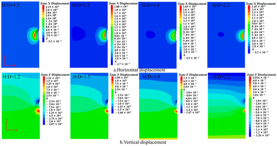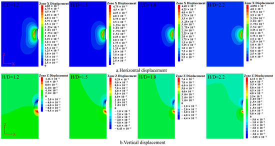 From Figure 7, it can be observed that under different height-to-diameter ratios, the displacement distribution patterns of caverns with different shapes are similar: displacement gradually decreases from the excavation surface to the surrounding rock. The left side of the cavern waist shifts rightward, while the right side shifts leftward, showing an overall outward expansion trend in the x-direction. In the y-direction, the surrounding rock at the cavern roof settles downward, while the surrounding rock at the cavern floor uplifts upward, showing an overall contraction trend toward the center. From Figure 9, it can be seen that the displacement at the cavern waist is 0.048 m for a cavern with a height-to-diameter ratio of 1.2, and 0.04 m for a cavern with a ratio of 2.2, decreased by 0.08 m. For the cavern with a ratio of 1.2, the displacement at the cavern roof is 0.10 m and at the cavern floor is 0.11 m, while for the cavern with a height-to-diameter ratio of 2.2, the displacement at the cavern roof is 0.03 m, representing an increase of 0.01 m, while the displacement at the cavern floor is 0.06 m, representing an increase of 0.03 m.