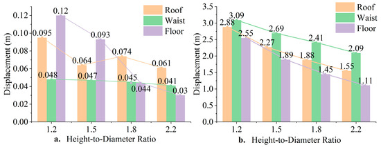 (a) Surrounding rock displacement during the solution mining stage with different height-to-diameter ratios. (b) Surrounding rock displacement during the operation stage with different height-to-diameter ratios.