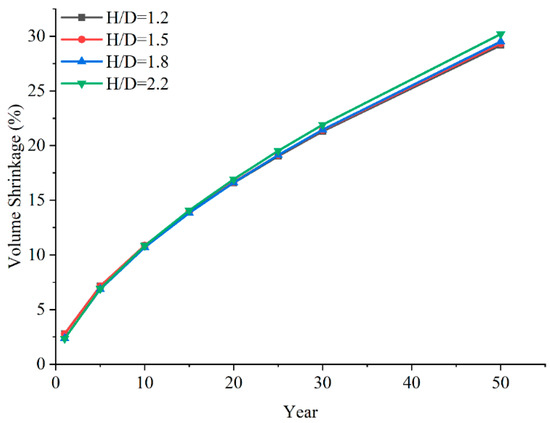 Figure 10 presents the change law of the volume shrinkage of SCGS with different height-to-diameter ratios. It can be observed that as the cavern operates, the volume shrinkage continues to increase. After 50 years of operation, only the cavern with a height-to-diameter ratio of 2.2 has a volume shrinkage exceeding 30%. As the height-to-diameter ratio increases from 1.2 to 2.2, the cavern volume shrinkage increases from 29.17% to 30.19%, showing an increase of 1.02%. The cavern volume shrinkage increases as the height-to-diameter ratio increases.