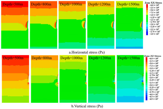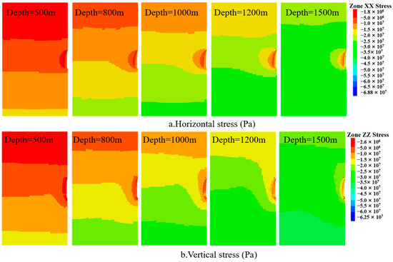 During the operation phase, the surrounding rock stress distribution of caverns at different burial depths is essentially the same. Similarly, as the burial depth of the cavern increases, the stress in all directions of the surrounding rock also increases (Figure 12). At the cavern waist, the x-direction stress is 2 MPa at a burial depth of 500 m and 2.7 MPa at a burial depth of 1500 m, increased by 0.7 MPa. At the cavern roof and floor, the z-direction stress is 3.33 MPa at a burial depth of 500 m and 7.23 MPa at a burial depth of 1500 m, increased by 4 MPa.
