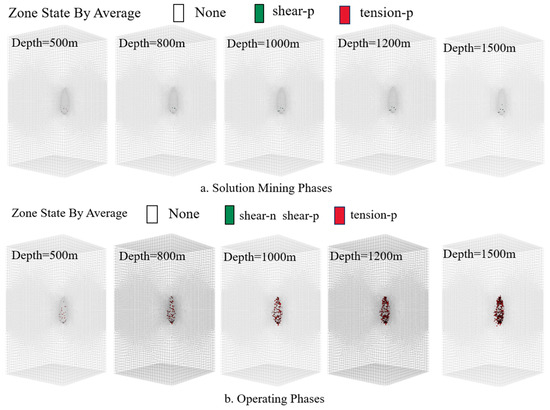 Figure 13a shows the distribution of the surrounding rock plastic zone during the solution mining phase at different burial depths. During the solution mining phase, the surrounding rock plastic zone is only located on the cavern surface, and there is no significant change in the plastic zone as the burial depth increases. When the burial depth is 500 m and 800 m, the plastic zone of the surrounding rock is consistent. However, when the burial depth reaches 1500 m, the plastic zone appears at the cavern waist, and the plastic zone area increases. The extent of the plastic zone increases as the burial depth increases.