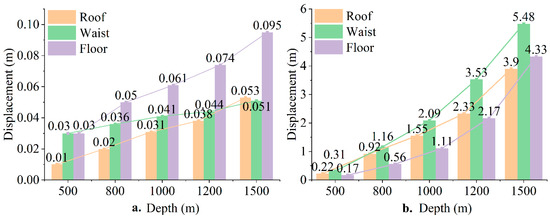 After 50 years of operation, the cavern displacement is shown in Figure 14b. As the burial depth increases, the range of surrounding rock displacement also gradually increases. At a burial depth of 500 m, the surrounding rock displacement is primarily located at the cavern surface, with a roof displacement of 0.22 m, waist displacement of 0.31 m, and floor displacement of 0.17 m. When the burial depth reaches 1500 m, the displacement range significantly expands from the cavern surface. The displacement at the roof is 3.90 m, at the waist is 6.48 m, and at the floor is 4.33 m.