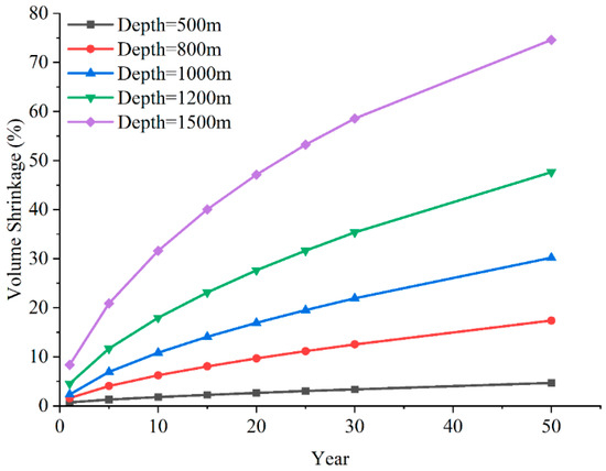 Figure 15 shows the variation in cavern volume shrinkage with time at different burial depths. As seen in the figure, as the burial depth of the cavern increases, the volume shrinkage also increases. After 30 years of operation, the cavern volume shrinkages for burial depths of 1200 m and 1500 m exceed 30%. When the burial depth is 500 m, the cavern volume shrinkage after 50 years of operation is only 4.6%. However, when the burial depth increases to 1500 m, the cavern volume shrinkage increases to 74.59%.