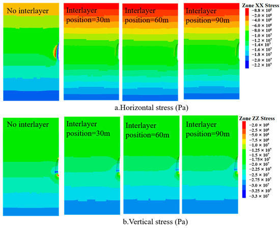 Surrounding rock stress during the operation phase under different interlayer positions.