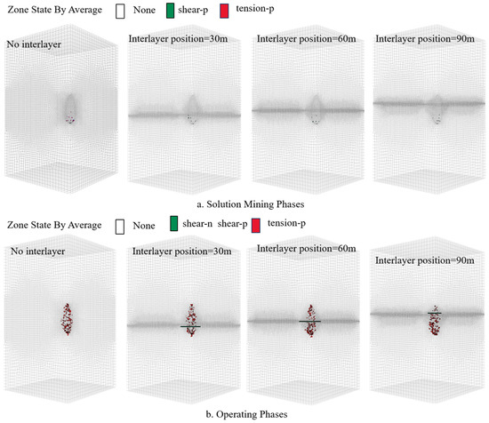 Figure 18b shows the distribution of the plastic zone after 50 years of operation under the influence of the interlayer. It is clear from the figure that after 50 years of operation, shear damage originating from the cavern surface expands outward at the interlayer location, and the plastic zone volume of the salt rock on both sides of the interlayer decreases. Notably, when the interlayer is located 30 m from the cavern floor, the surrounding rock plastic zone volume is the smallest. When the interlayer is located 90 m from the cavern floor, the plastic zone volume of the cavern surrounding rock is the largest. The largest extent of interlayer damage occurs when the interlayer is located 60 m from the cavern floor.