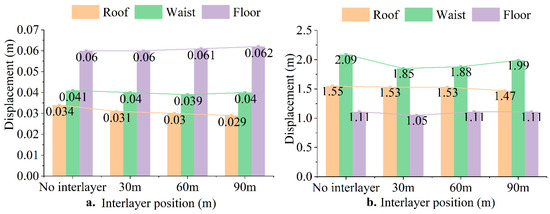 (a) Surrounding rock displacement during the solution mining stage with different interlayer positions. (b) Surrounding rock displacement during the operation stage with different interlayer positions.