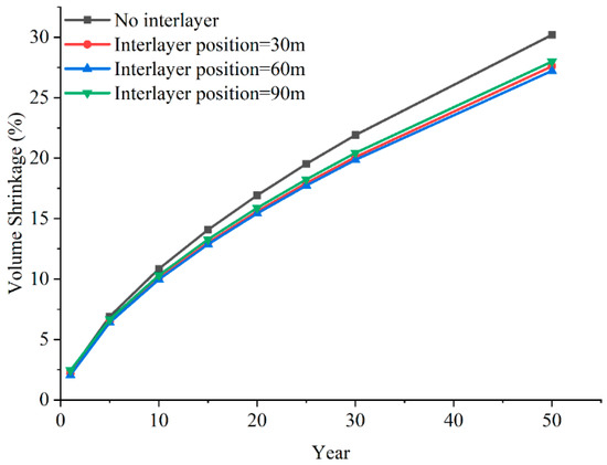 Figure 20 shows the variation in cavern volume shrinkage with time under the influence of different interlayer positions. It can be seen that the cavern volume shrinkage is significantly reduced due to the presence of the interlayer. Without the interlayer, the cavern volume shrinkage is 30.20%. When the interlayer is present, the cavern volume shrinkages are 27.59%, 27.22%, and 27.97%, respectively. This indicates that the presence of the interlayer has a significant impact on the cavern volume shrinkage, with the most notable reduction in contraction occurring when the interlayer is located at 60 m.