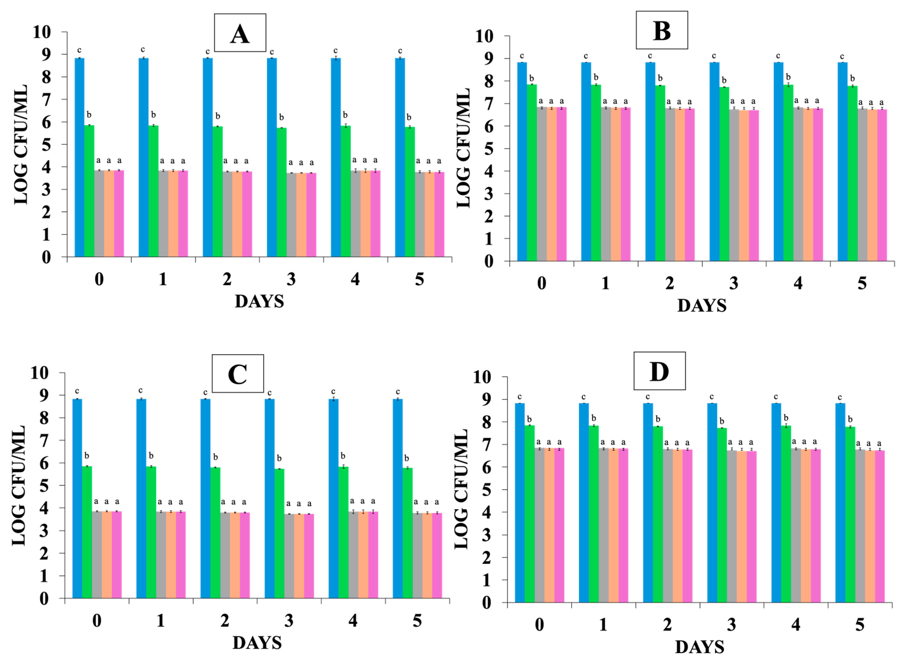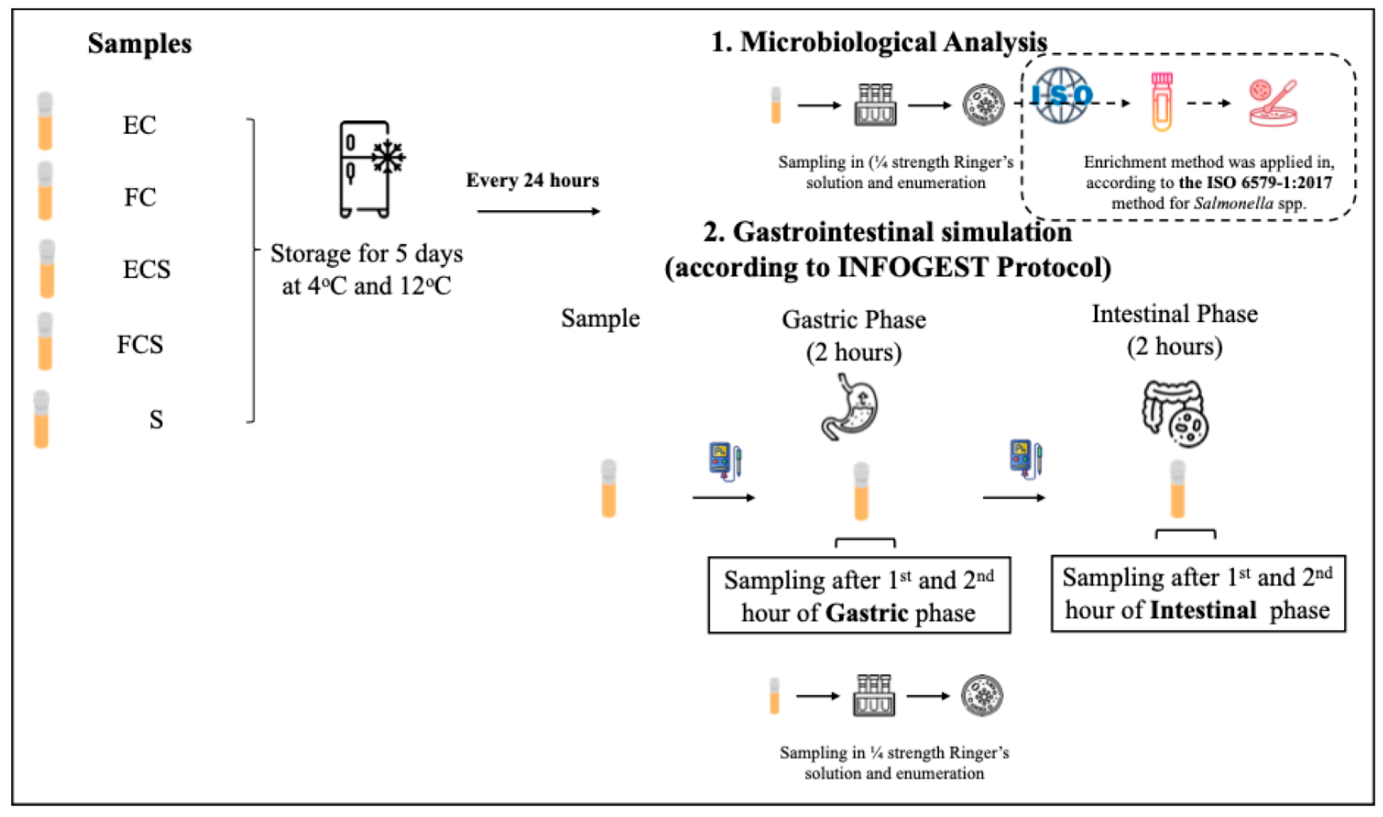 Two batches of samples with four technical replicates in each batch were stored at 4 °C and 12 °C for five days. Every day, samples were withdrawn from both temperatures (4 °C and 12 °C) for microbiological analysis to examine the effect of probiotic strains both as free and encapsulated forms on co-cultured S. enterica in orange juice. In parallel, samples were examined daily for the survival of S. enterica during and after exposure to simulated GIT conditions. In detail, the population of S. enterica with probiotic strains were examined in the gastric phase after 1 h, gastric phase after 2 h, intestinal phase after 1 h, and intestinal phase after 2 h.
