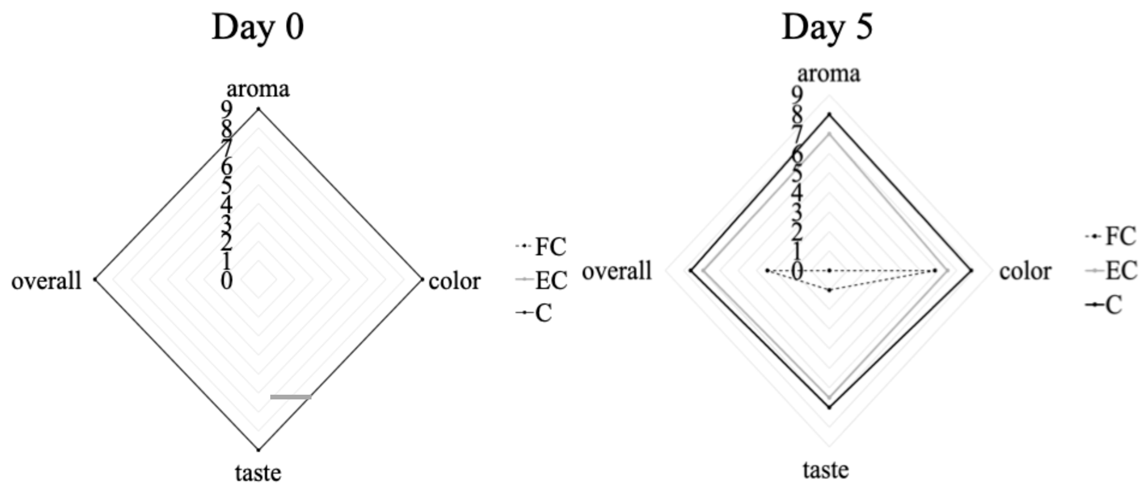 Sensory analysis was performed daily for FC and EC, assessing the attributes of aroma, taste, color, and overall acceptance.