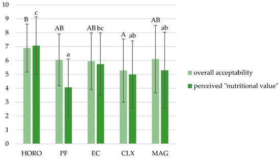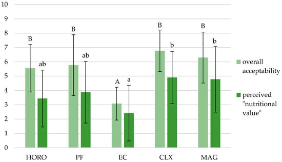 Overall sensory quality of short-dough biscuits and estimated nutritional value of products assessed based on sensory analysis. A, B; a, b, c—the same letters indicate homogeneous groups based on Tukey’s test (p-value < 0.05); PF—biscuits with palm fat; HORO—biscuits with high-oleic rapeseed oil; EC—biscuits with ethycellulose oleogel; CLX—biscuits with candelilla wax oleogel; MAG—biscuits with monoglyceride oleogel.