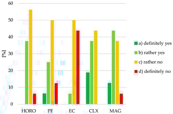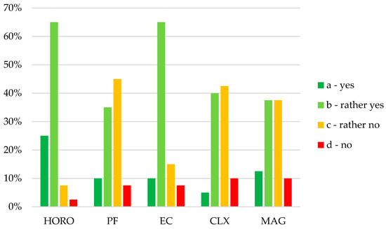 Structure of the sensory panel response to the question: “Would you buy these biscuits?”. PF—biscuits with palm fat; HORO—biscuits with high-oleic rapeseed oil; EC—biscuits with ethycellulose oleogel; CLX—biscuits with candelilla wax oleogel; MAG—biscuits with monoglyceride oleogel.