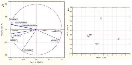 A principal component analysis was performed to summarize the sensory properties of biscuits. Variables selected for analysis included those considered important in assessing the overall quality of the products (desirable aroma, surface “greasiness,” and hardness) as well as those that demonstrated statistically significant differences (rancid odor, crispness, foreign and desired flavors, overall quality, and predicted nutritional value)—the selected variables defined the first two factors by 94.47%. The first factor was strongly positively correlated with rancid odor and foreign flavors, and strongly negatively correlated with desired aroma, hardness, crispness, desired flavor, quality, and nutritional value (Table 4). The second factor was positively correlated with the surface “greasiness.” Based on the variable projection (Figure 3a), it can be observed that the overall sensory quality of the products is correlated with the predicted nutritional value (both variables are very close to each other). Moreover, desired taste also correlated strongly positively with these attributes and strongly negatively with foreign taste and rancid odor (Figure 3a). It can be assumed that these sensory attributes (desired taste, foreign flavor, and rancid odor) have the most significant impact on consumers’ overall product evaluation. In contrast, the “greasiness” of the product surface did not significantly affect product perception or acceptability, as this variable did not correlate with overall quality. A correlation was also demonstrated between texture parameters: hardness and crispness.
