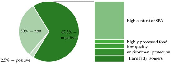 Respondents could independently justify their chosen answer when asked about associations with palm oil. Approximately 3% of survey participants claimed to have positive associations. In their opinion, palm oil had good technological properties. 30% of respondents had no associations with this oil, and over two-thirds of respondents declared a negative attitude. Most of them (63%) justified their response by citing the low nutritional value of the oil due to its high content of saturated FAs, followed by reasons related to ecology and environmental protection (11%) and the presence of trans fatty acids (TFAs) (11%) (Figure 5). The media are paying increasing attention to ecology and the negative impact of oil palm cultivation on the natural environment. Even well-known brand manufacturers use graphic symbols emphasizing the absence of palm oil in their products or informing that the raw material comes from certified plantations []. Respondents’ association of palm oil with TFAs is not entirely accurate. TFAs are not present in raw palm oil. Only after refining, due to high temperatures, TFAs may appear in this oil, but their content does not exceed a few percent []. Some respondents negatively associated this oil with processed foods (5%) and low quality (5%) (Figure 5). Due to its low price and good stability, palm oil is often used in highly processed products. Due to its relatively low nutritional value, it may be associated with low-quality products.