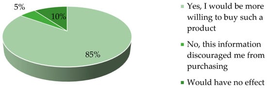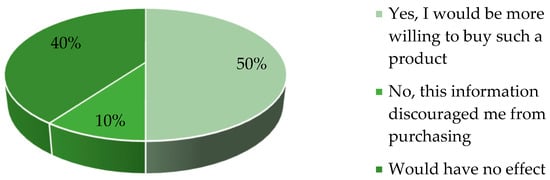 The survey also attempted to determine consumer opinions on the advisability of using green tea extract in food. Half of the respondents claimed that information about such an additive would increase their willingness to purchase the product, while for 40% it would be irrelevant. However, for 10% of respondents, the declaration of the presence of such an ingredient could even negatively influence their choice (Figure 6). Such a high percentage of people with a positive attitude toward green tea extract may stem from their knowledge of publicly available information about the health-promoting properties resulting from the high antioxidant content of teas []. It was found that informing consumers about the high content of antioxidants in the product may increase the likelihood []. In the consumer studies of Moin et al. [], it was found that the willingness to eat biscuits fortified with green tea was correlated with the attitude of health concern. Moreover, these people were willing to consume biscuits fortified with moringa extract.