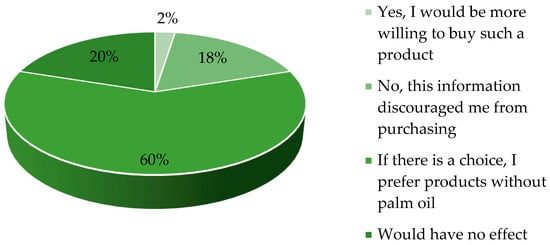 In a study conducted by Onacik-Gür et al. [], 38% of students found that the ingredients and information on the packaging had a significant impact on their food purchasing decisions. In another study [], 30% of Italian respondents declared that they buy palm oil-free products very often, 19% often, and 20% seldom. Their choices were primarily based on healthiness (38%), then lower environmental impact (25%), and preservation of tropical forests (14%).