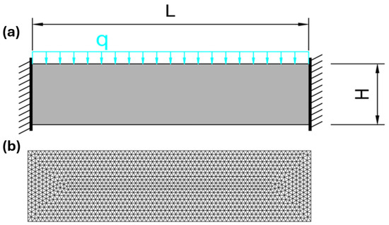 To demonstrate the practical application of the presented method, consider a deep beam modeled under plane stress conditions. The beam has a length of and a height of . It is loaded by a uniform pressure applied along its top edge, acting vertically downward. The bottom edges of the beam are free, while the vertical edges at and are fully restrained, allowing no horizontal or vertical displacements.