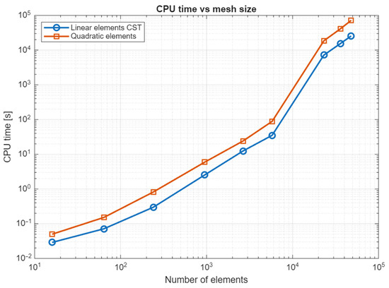 CPU time versus number of elements for CST and quadratic triangular elements.