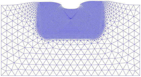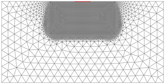 The geometry of the soil block and loading line is shown in Figure 6. A locally refined mesh was applied below the footing to capture the failure zone. The final model contained 5227 nodes and 10,302 triangular elements.