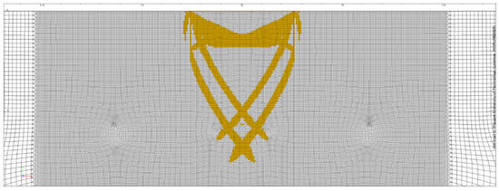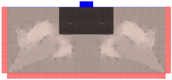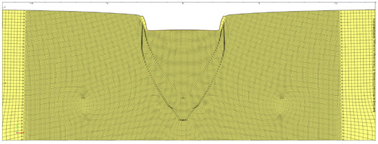For comparison, the same strip footing problem was solved using the commercial finite element program ZSoil. The analysis was performed in plane strain conditions with an elastoplastic material model based on the Mohr–Coulomb criterion. The numerical mesh contained 75,642 enhanced assumed strain (EAS) elements. In the central zone under the footing a refined mesh with 5 cm elements was applied, while outside this zone the mesh was gradually coarsened to 15 cm (see Figure 9). This discretization is free from volumetric locking because of the EAS formulation.