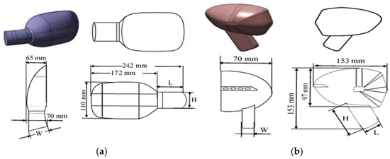 The two side-view mirror models used in the analyses, with different body geometries, arm geometries, and mounting styles, are shown in Figure 1a,b. In the mirror arm geometry, the dimensions of the plane parallel to the flow, inclined toward the vertical in the plane perpendicular to the flow, and inclined toward the horizontal in the plane perpendicular to the flow were defined as width (W), height (H) and length (L), respectively. The effects of these 3 parameters on the drag performance of the side-view mirror were examined using Taguchi orthogonal arrays.