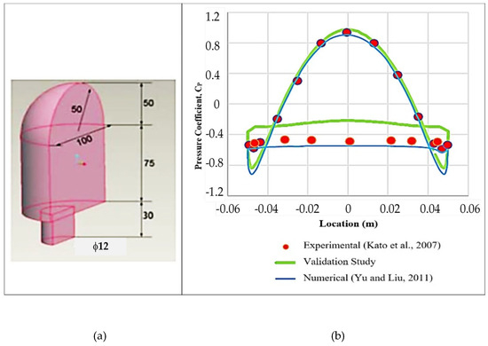The numerical modeling approach was validated by the study of Yu and Liu [1] and Kato et al. [10], who examined a standard mirror model numerically and experimentally, respectively. In the validation study, the geometric model and the flow conditions in the reference studies were adopted. The realizable k-ε turbulence model was used for a flow velocity of 30 m/s. The side-view mirror geometric model and the pressure coefficient variation are presented in Figure 3a and Figure 3b, respectively. The pressure coefficient values showed agreement with the values obtained in the reference numerical and experimental studies.