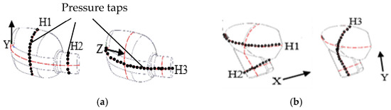 The schematic views of the side-view mirror with pressure taps: (a) Model 1, (b) Model 2.